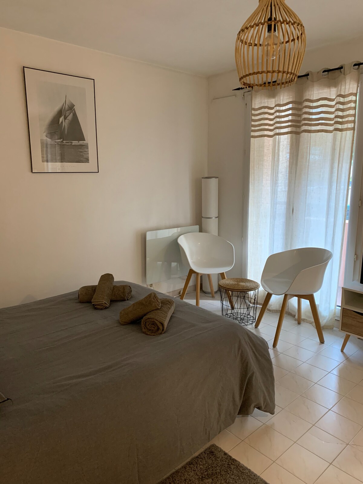 Studio de 28 m2 pour 2 personnes climatisé en rez de jardin dans résidence calme avec place de parking privé, proche commerces,transports et plages. Commerces : 10 mn a pied transports : arrêt de bus en face de la résidence,gare a 2 mn à pied Bus : 10 mn en bus pour vous rendre au Palais des festivals ( trafic fluide ) Train : 5 mn de train pour vous rendre a la gare de Cannes et il vous reste 6 mn de marche pour vous rendre au Palais des festivals plages : 5 mn à pied