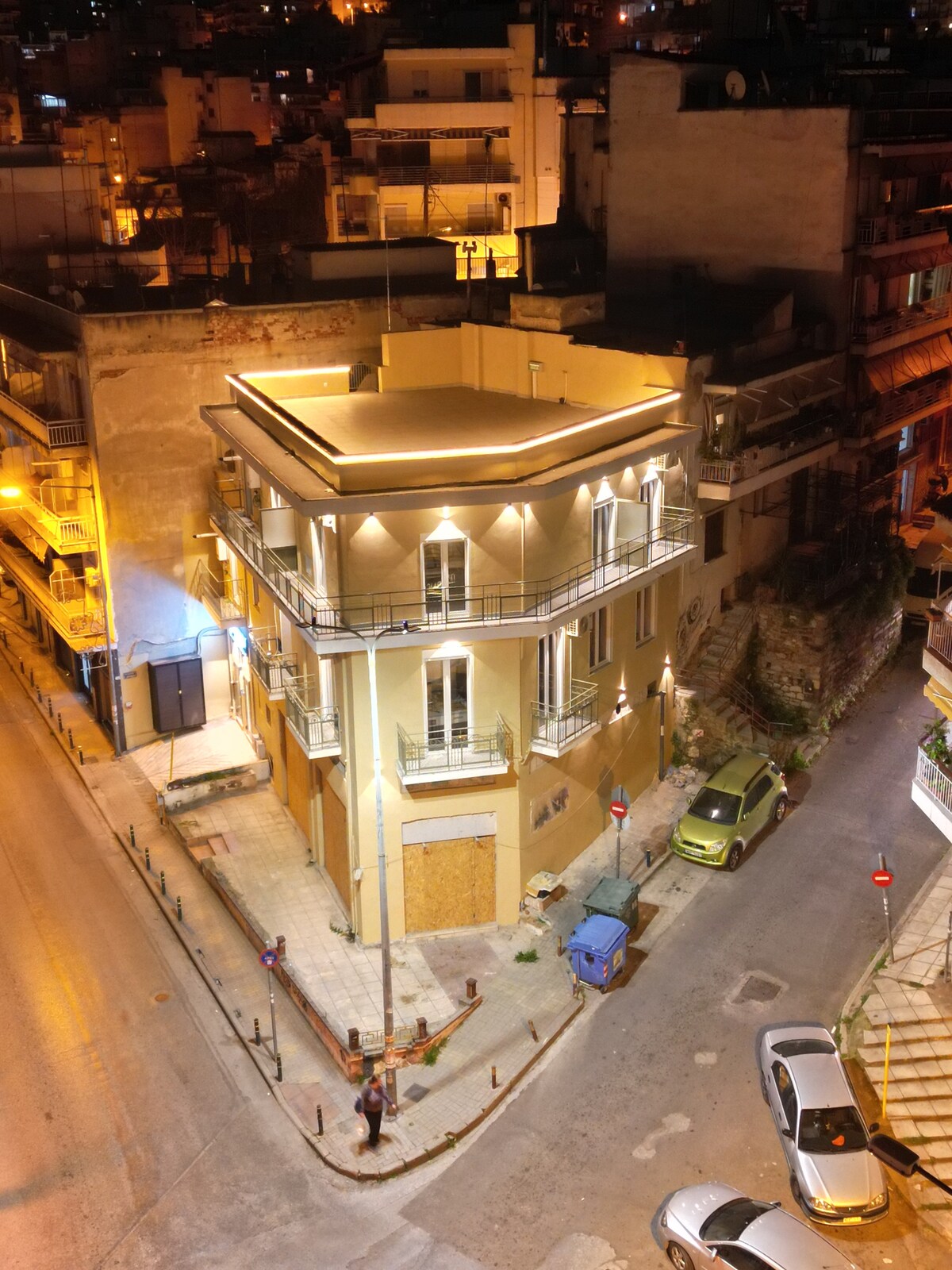 Adéntrate en la historia y la comodidad con nuestro elegante apartamento de un dormitorio que ofrece impresionantes vistas de las murallas bizantinas occidentales de Tesalónica, un sitio declarado Patrimonio de la Humanidad por la UNESCO, bellamente iluminado por la noche. Disfruta de mañanas tranquilas o noches románticas en tu balcón privado, completo con acogedores muebles de exterior. En el interior, encontrarás una lujosa cama doble, un sofá cama para huéspedes adicionales, una cocina totalmente equipada y tu propia máquina de café espresso para ese momento perfecto de café.