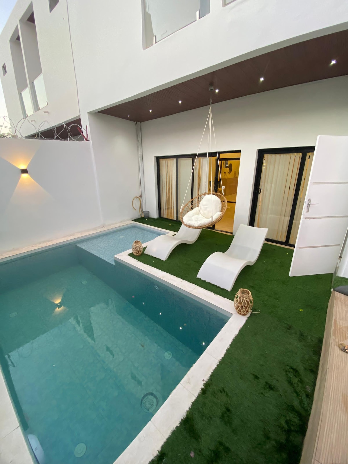 Villa Duplex de charme avec Piscine - 2 chambres, Salon, Cuisine Américaine entièrement équipée, Mezzanine, Wi-Fi Internet, Cuisine Externe, Terrasse Barbecue, Gardiennage 24h/24, 7j/7, à 300 m de la plage et à 5 min de Saly Centre Brand New Duplex Villa with Swimming Pool, 2 Bedrooms, Living Room with Internal Kitchen, Mezzanine, Wi-Fi, Exterior Kitchen with Barbecue Place, Security Guard 24/7, 5 minutes from Downtown Saly, 300m from the Beach