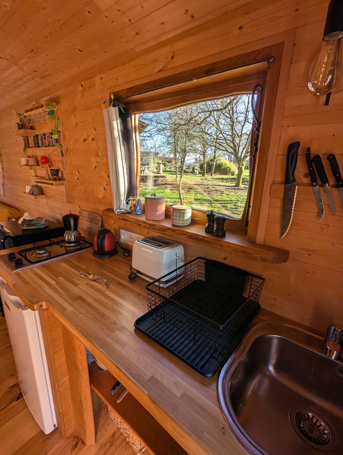 La Roulotte se compose d'une chambre pouvant accueillir 4 personnes (avec un lit de 160x200 et un canapé convertible), d'une cuisine équipée, d'un coin salle à manger, et d'une salle d'eau avec toilette sèche, douche et lavabo Elle est chauffée et isolée, pouvant donc être louée tout au long de l'année. Nous pouvons vous prêter un lit parapluie, une chaise haute et une baignoire gonflable. Dans le tarif est inclus les draps des lits, les torchons, le ménage de fin de séjour et la taxe de séjour