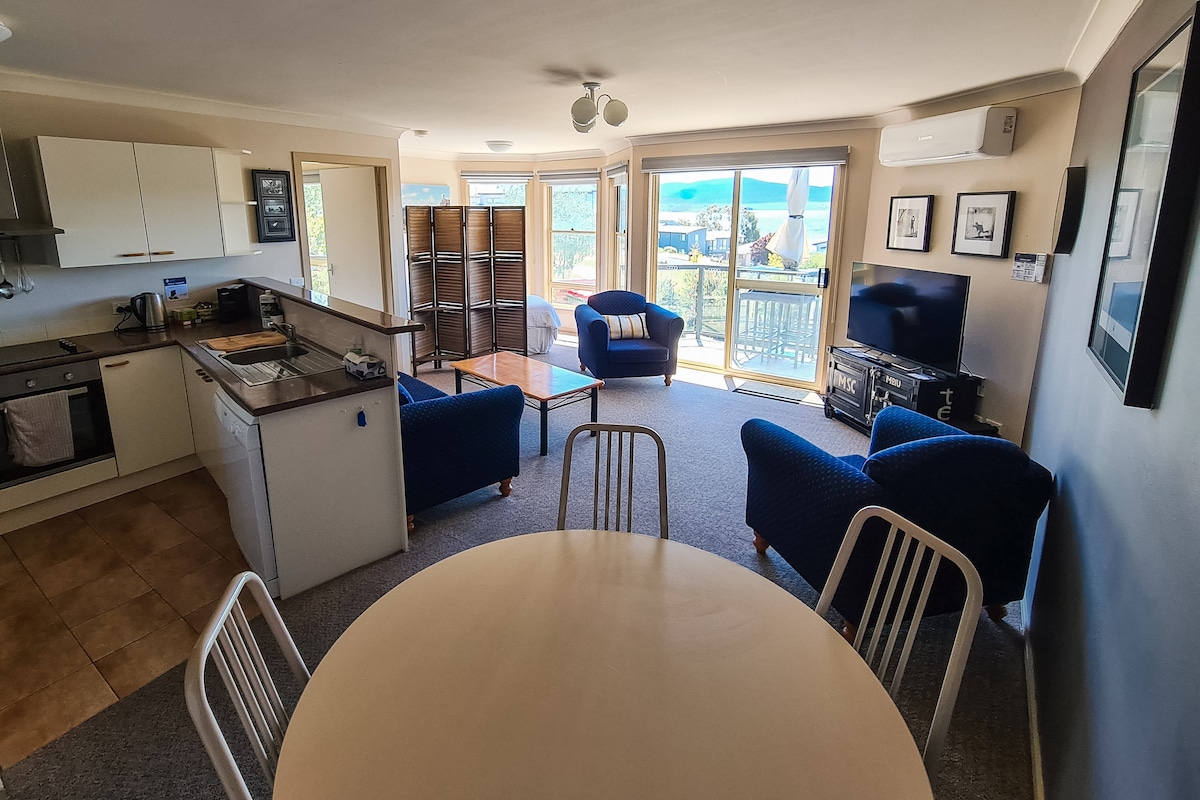 Luxury Tyrolean Village retreat with unsurpassed panoramic views across Lake Jindabyne & Mountains. Your year-round base for skiing, Thredbo MTB, fishing & lake fun! Relax in the private sauna after a day of adventures. Games room with ping pong & fire pit await. Direct access to stunning walking & MTB trails Features two queen rooms & a loft with four double beds (bunks), a walk in robe & ensuite. The kitchen, laundry & single garage with ski/board/gear racks takes care of the necessities.