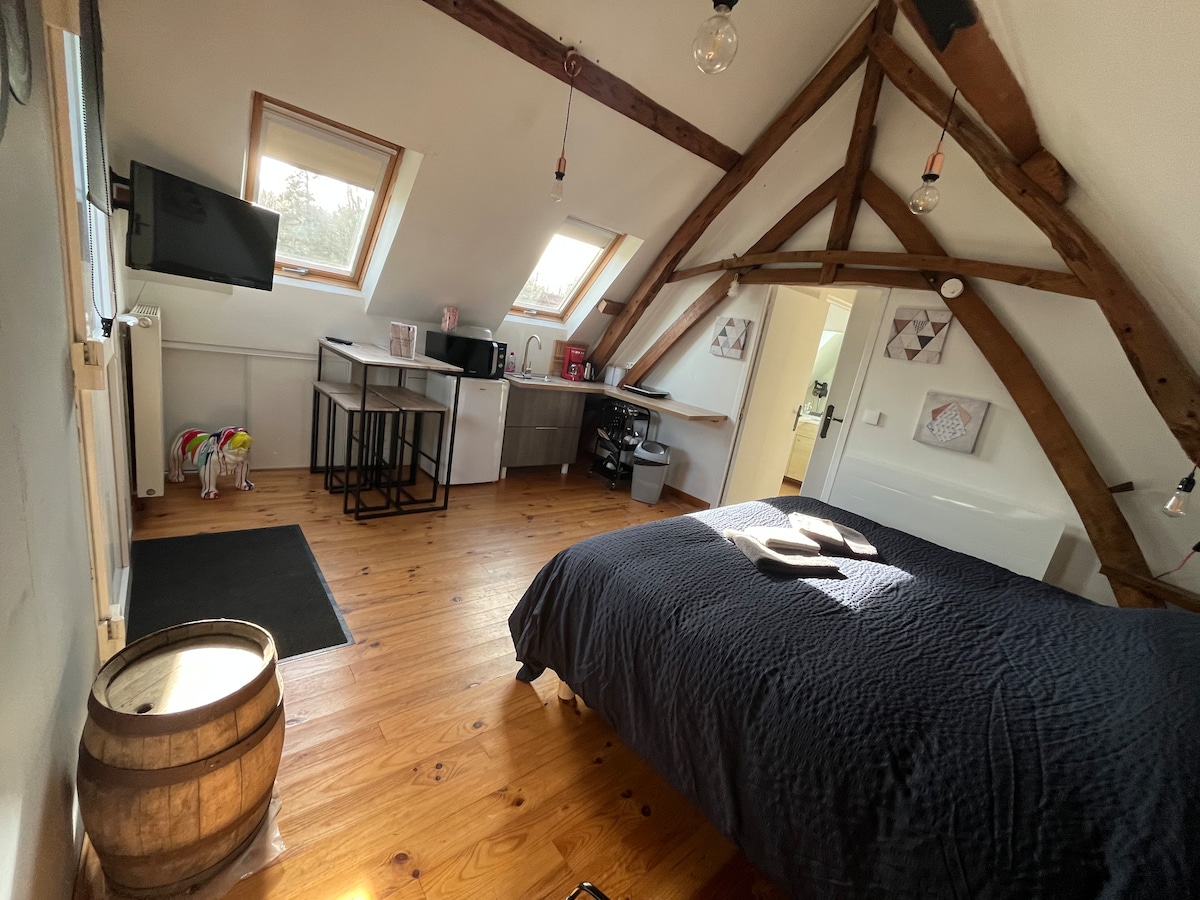 Estudio para 2 personas (posibilidad 3) nuevo, acondicionado en un antiguo establo en Héricourt, pequeño pueblo situado a 7 km de St Pol sur Ternoise o de Frévent, a 8 minutos del circuito de cruces, a 45 minutos de la playa y de Arras. Situado en la planta superior, accesible por una escalera exterior Cuarto de baño con ducha, aseo separado, un dormitorio con vestidor (cama para 2 personas) No se admiten animales Ideal para una estancia en el campo Actividades: paseos, campo de fútbol y multideportivo a 300 m