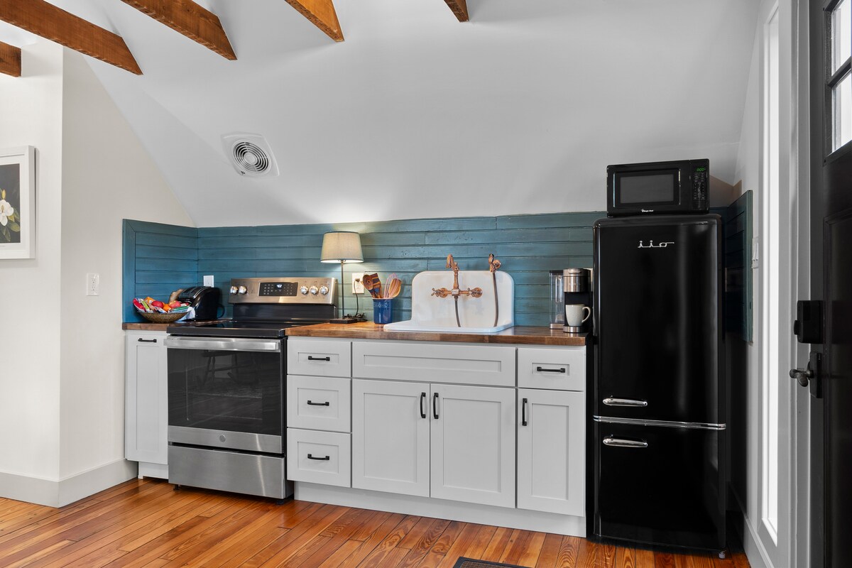 Entra con estilo en este acogedor alojamiento de 1 dormitorio/1 baño en el primer piso. Entrada para 2 coches. Entrada con teclado en la sala de estar con sofá cama, escritorio, silla y TV inteligente Samsung de 50 pulgadas. La cocina con encimera de granito está totalmente equipada con todo lo necesario y una barra de desayuno para sentarse y comer. El granito se extiende hasta el tocador del baño con mucho espacio en el mostrador y los cajones, equipado con artículos de tocador. El dormitorio tiene cama tamaño queen, cómoda, vestidor, TV inteligente y chimenea eléctrica. La puerta corredera conduce al patio con parrilla y conjunto de bistró.