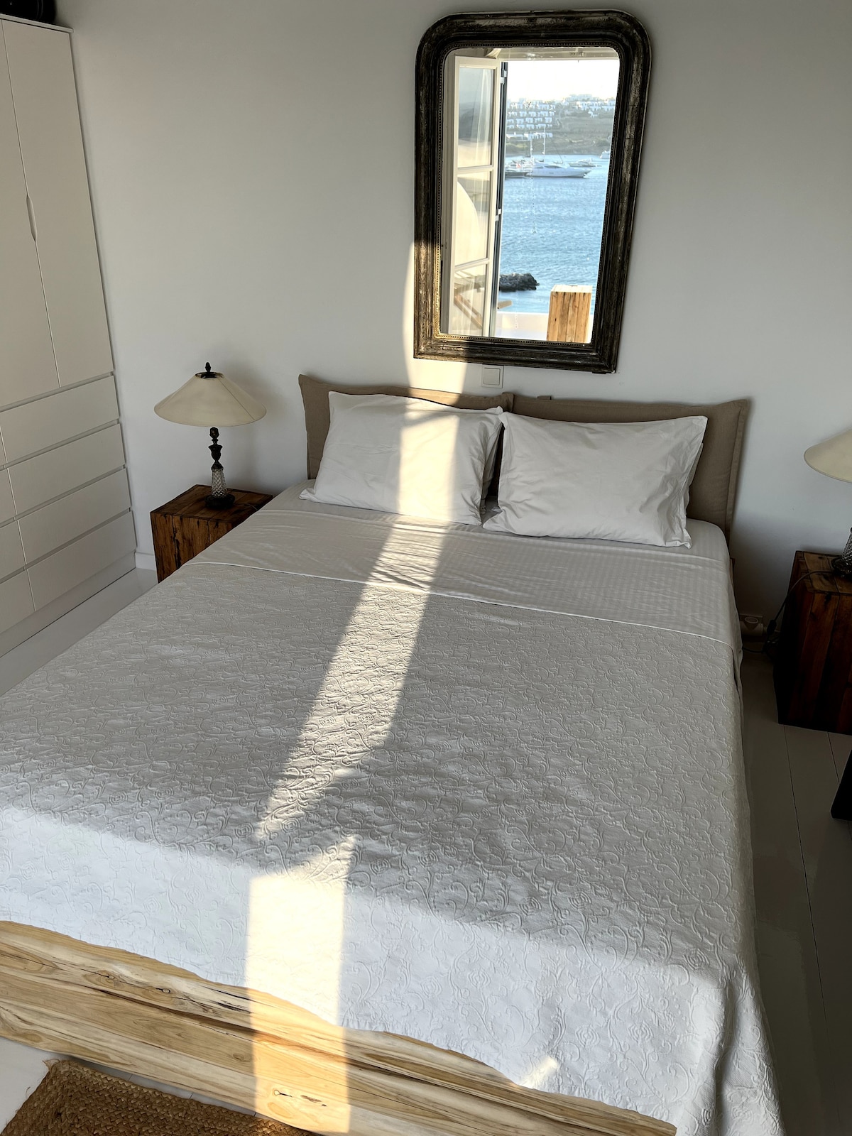 Frente al mar, muy bonito apartamento, gran dos habitaciones en el segundo y último piso, solo como una casa. Junto al apartamento, hermosa terraza de 38 metros cuadrados con vistas al nuevo puerto, el mar y las islas vecinas (Dilos,Syros,Mykonos,Naxos,Paros). Desde todas las habitaciones principales se puede admirar el mar. Mucho encanto, materiales de calidad, decoración sutil y artística. Muy bien situado en el centro de la ciudad: transporte, tiendas, restaurantes, playas cercanas
