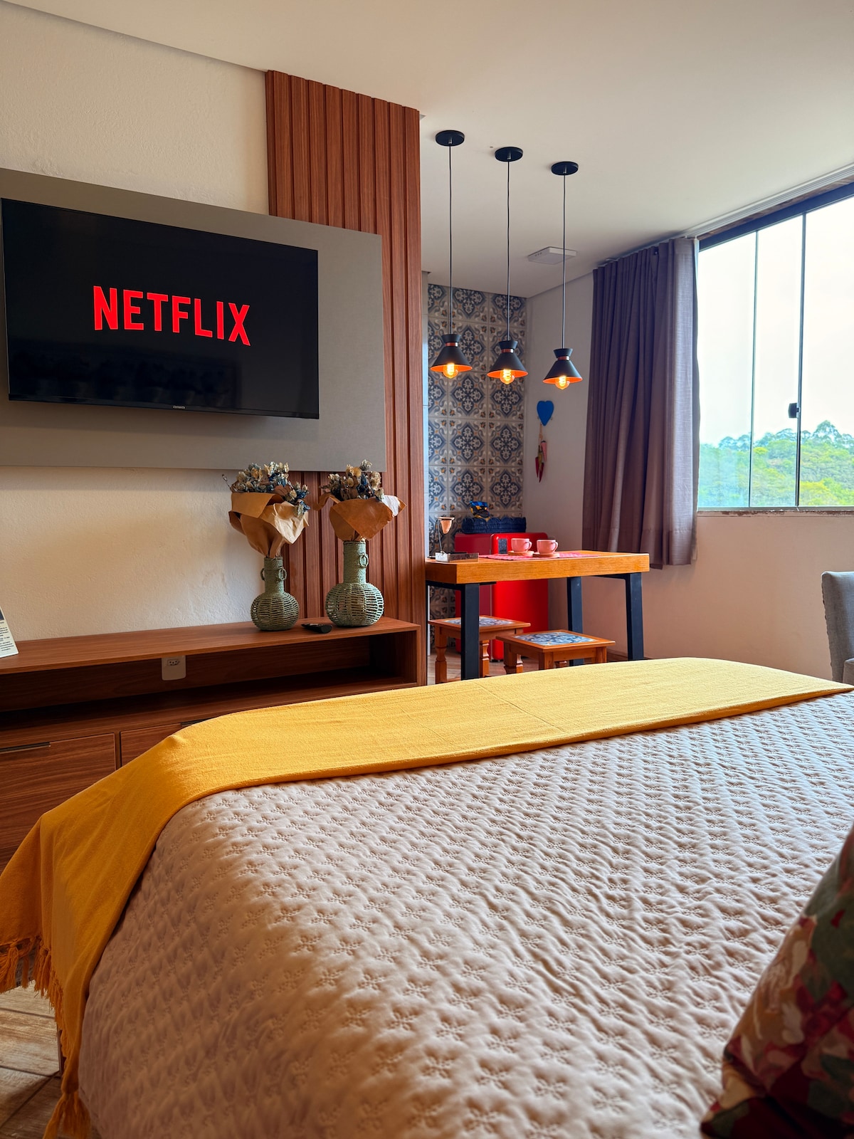 ¡Bienvenido a nuestro recién inaugurado mini-loft! Ubicado en @espaçonossatiradentes, esta habitación cuenta con: - Cama doble; - Cocina de inducción; - Minibar - Utensilios de cocina; - Armario para ropa; - Aire acondicionado; - WI-FI - Televisión con SKY+ incluido. Un diseño cálido, pensado para que una pareja disfrute de Tiradentes sin preocupaciones. Además, tenemos una hermosa vista de la Serra. La suite está en el 1º piso del Espacio, ubicado a 800 metros de la plaza principal de la ciudad, en línea recta.