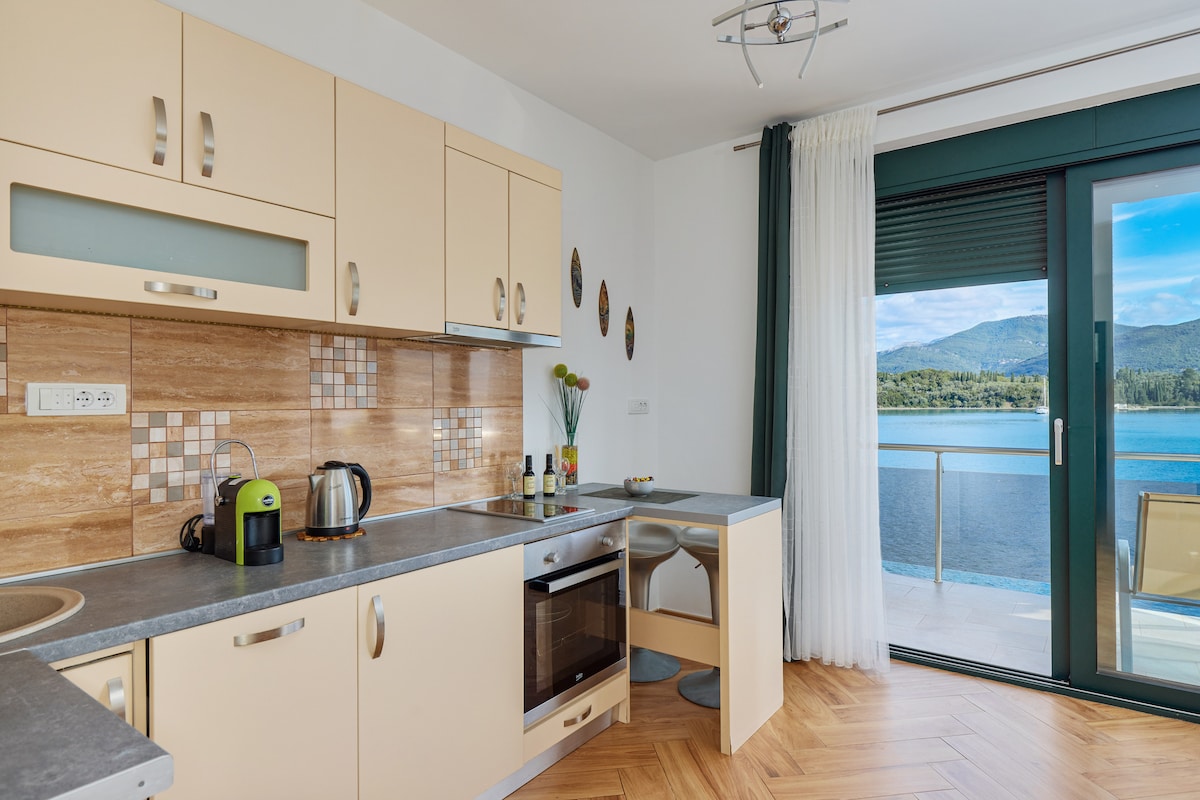 Apartamento de piedra frente al mar de 38 m²/410 pies² totalmente renovado, a poca distancia del mejor restaurante y del embarcadero de hormigón. Vistas panorámicas☞ ininterrumpidas de la bahía de Boka Tablas de☞ surf de remo incluidas Balcón ☞ grande con sofá privado al aire libre. ☞ A 50 metros del famoso restaurante 'Porto Bjelila' Wi-Fi ☞ de 96 mbps ☞ Salga al mar ☞ Ubicado en un tranquilo pueblo de pescadores