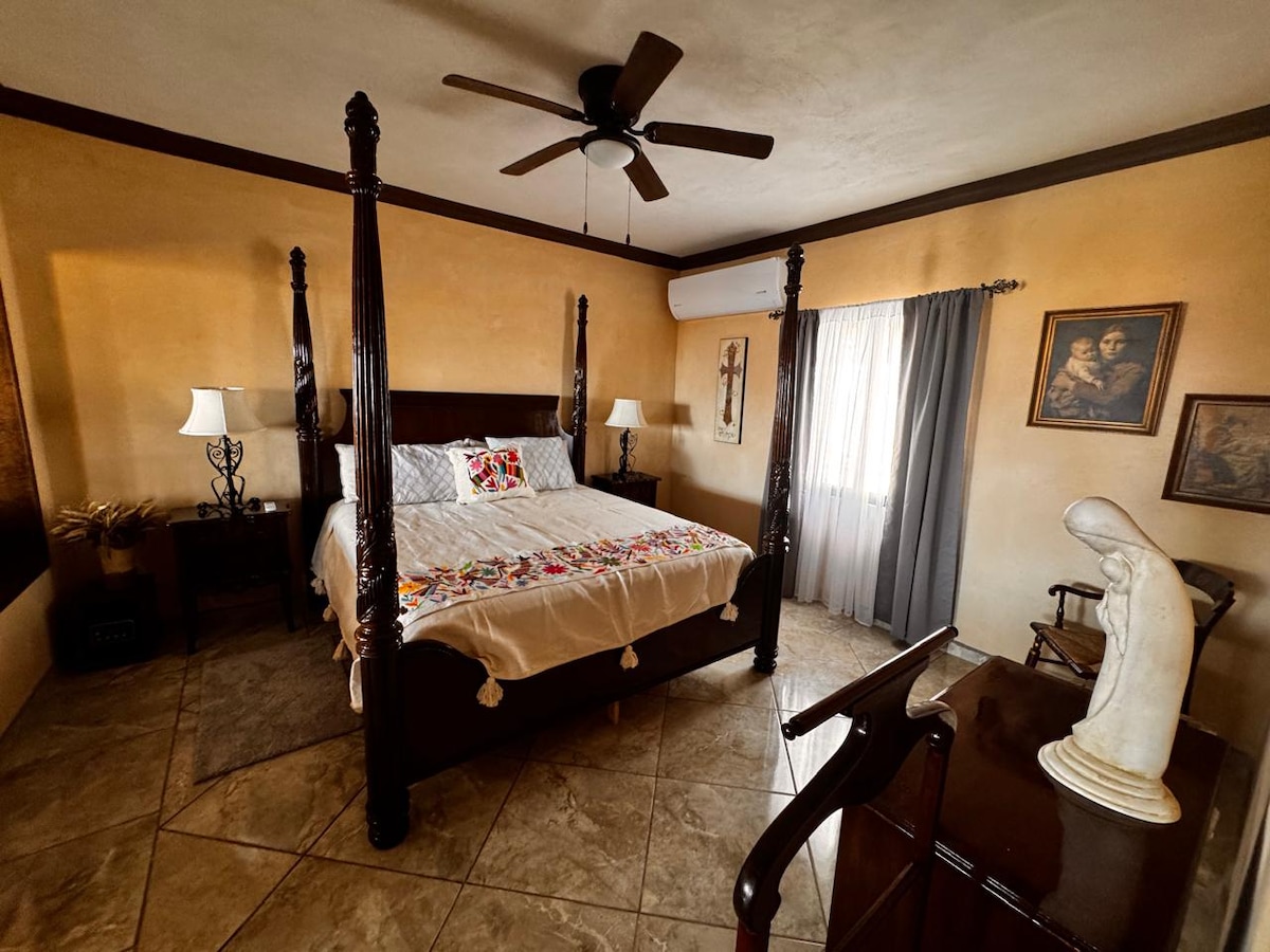 Bienvenidos sean desde cualquier parte del mundo a este alojamiento en el corazón de Todos Santos, una opción ideal para tu proximo viaje. Cuenta con amplia terraza donde se puede apreciar el mar y la sierra, a unos minutos caminando del Centro, donde puedes visitar las galerías, restaurantes y el famoso Hotel California. Equipado para que tu escapada de diversion o de trabajo sea inolvidable. Contamos con estacionamiento privado y seguro y una tienda de conveniencia al cruzar la calle.