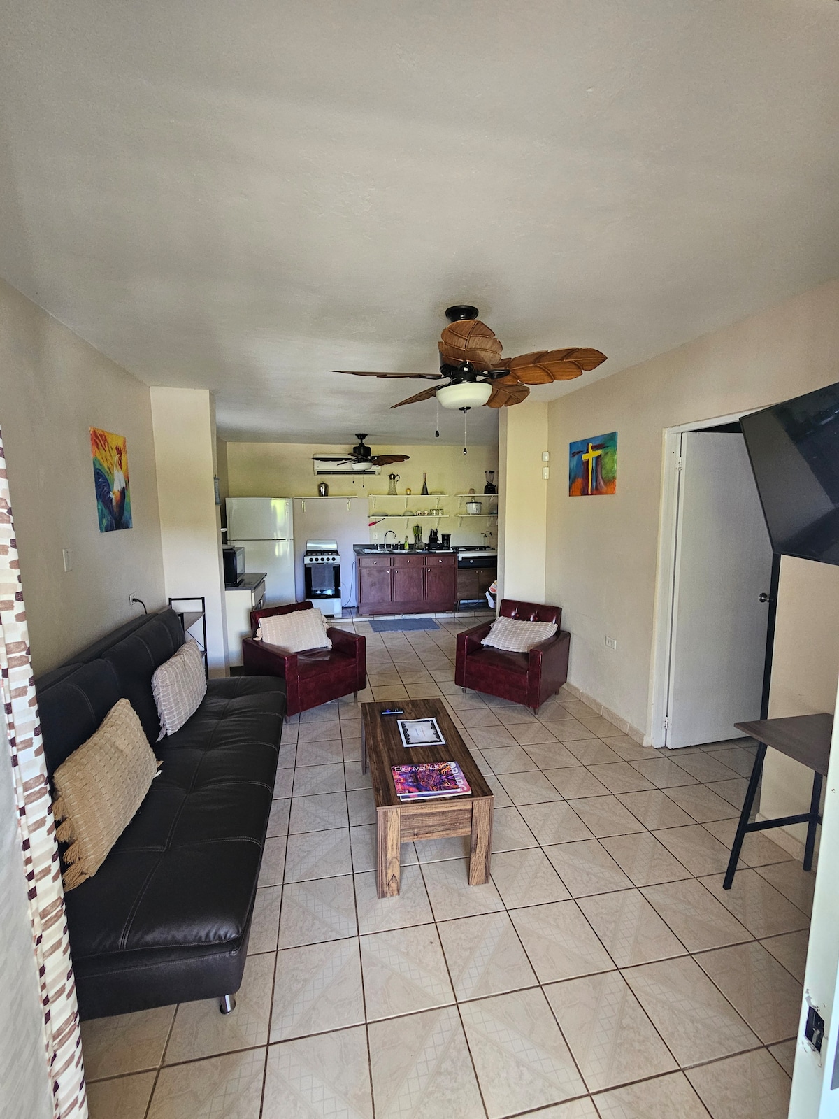 Located at the 1st floor, 1 bedroom with 1 queen size bed and 1 Fulton in the living room to accommodate up to 3 people total. 1 bathroom, fully air conditioned , fully equipped kitchen dinning room combination, Living room and a terrace to sit out or eat your meals. The house is equipped with solar panels and generator that provide alternative energy to power the basic essentials in case of outrages near many attractions