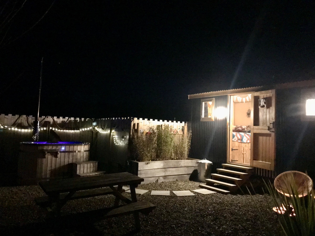 Disfruta del encantador entorno de este romántico lugar en el corazón de North Devon, rodeado de naturaleza. Esta cabaña de pastores a medida está situada en un campo de 3 acres con su propio río serpenteando a través. Construida pensando solo en la comodidad para que puedas relajarte junto al calor de la chimenea de leña, leer un libro o ver la televisión en la cama tamaño king. Este es el lugar ideal para disfrutar de las vistas del atardecer, los cielos nocturnos estrellados y el sonido del río mientras te relajas en el jacuzzi de leña con tu persona favorita.