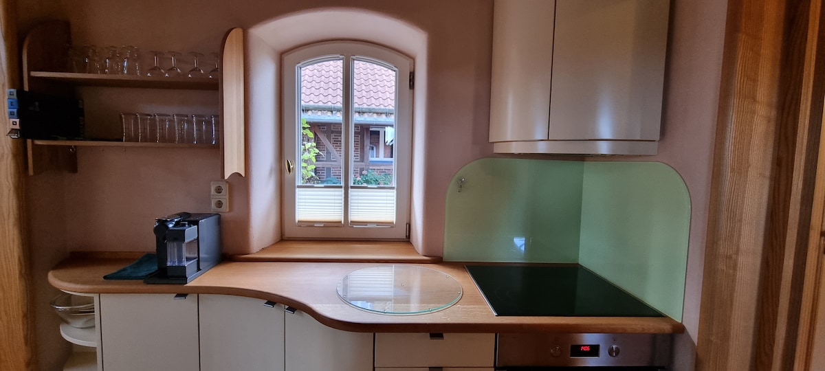 Das ehemalige Backhaus wurde unter Beachtung der fernöstlichen Harmonielehre Feng Shui und Verwendung hochwertiger Naturmaterialien (Lehm, Holz) aufwändig saniert. Es beeindruckt durch die Tischlerarbeiten, bspw. die als Unikat gefertigte Vollholzküche mit Miele-Geräten. Es ist eine Unterkunft für Menschen, die das Besondere schätzen und die in Hinblick auf Individualität und Detailverliebtheit ihresgleichen sucht.