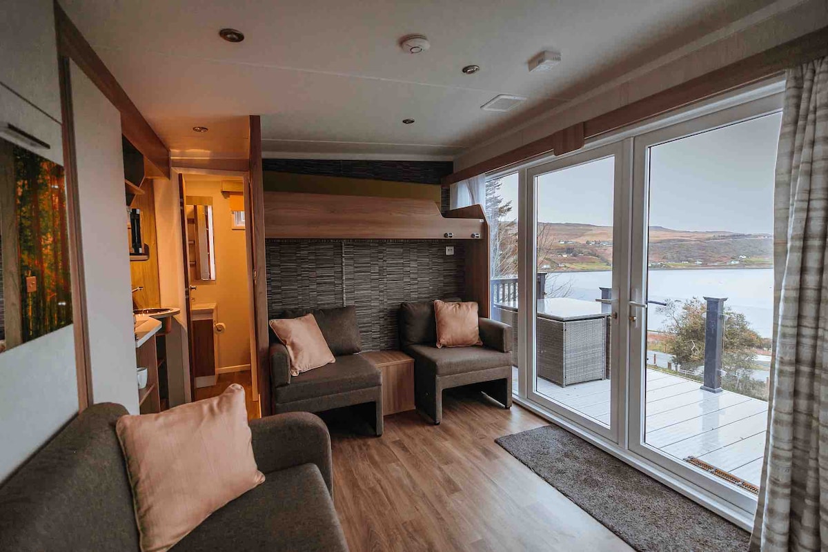 Las minicasas independientes de lujo pueden alojar a 2 adultos y 2 niños . Impresionantes vistas a la bahía de Uig. La casa es una sala de estar/dormitorio de planta abierta con un baño independiente. El sofá se puede bajar a una cama doble y un sofá doble se convierte en una pequeña litera individual con una litera más alta. La cocina tiene nevera, microondas, hervidor y tostadora. Cada casa tiene una zona de terraza elevada que te permite disfrutar de las vistas abiertas vírgenes a la bahía de Uig y Fairy Glen. Estacionamiento disponible. No se admiten perros.