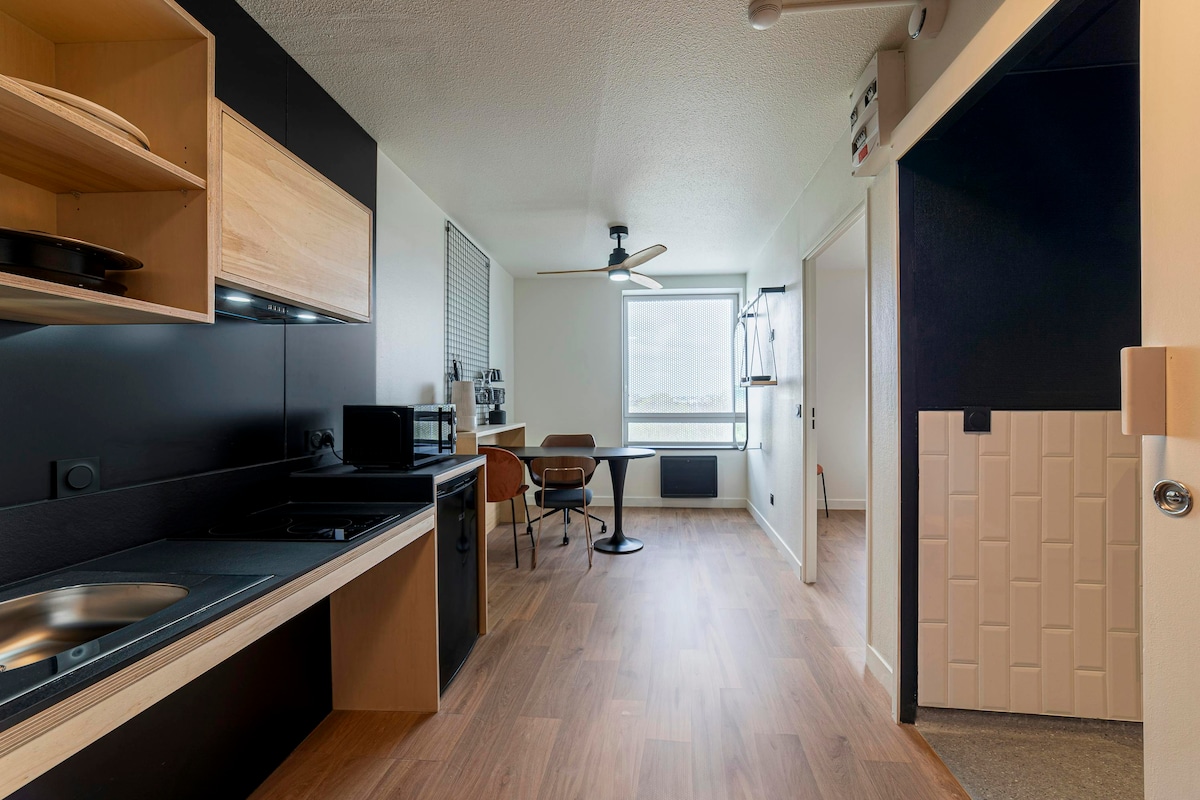 Este espacio de 21 m² cuenta con una gran cama tamaño queen (160x200 cm), una cocina totalmente equipada con cafetera, microondas, estufa de inducción, utensilios de cocina y jabón, wifi de alta velocidad, ventilador de techo, estacionamiento privado seguro (gratuito para estancias cortas) y acceso a servicios como gimnasio, sala de proyección, estudio de juegos, comedor y jardín.