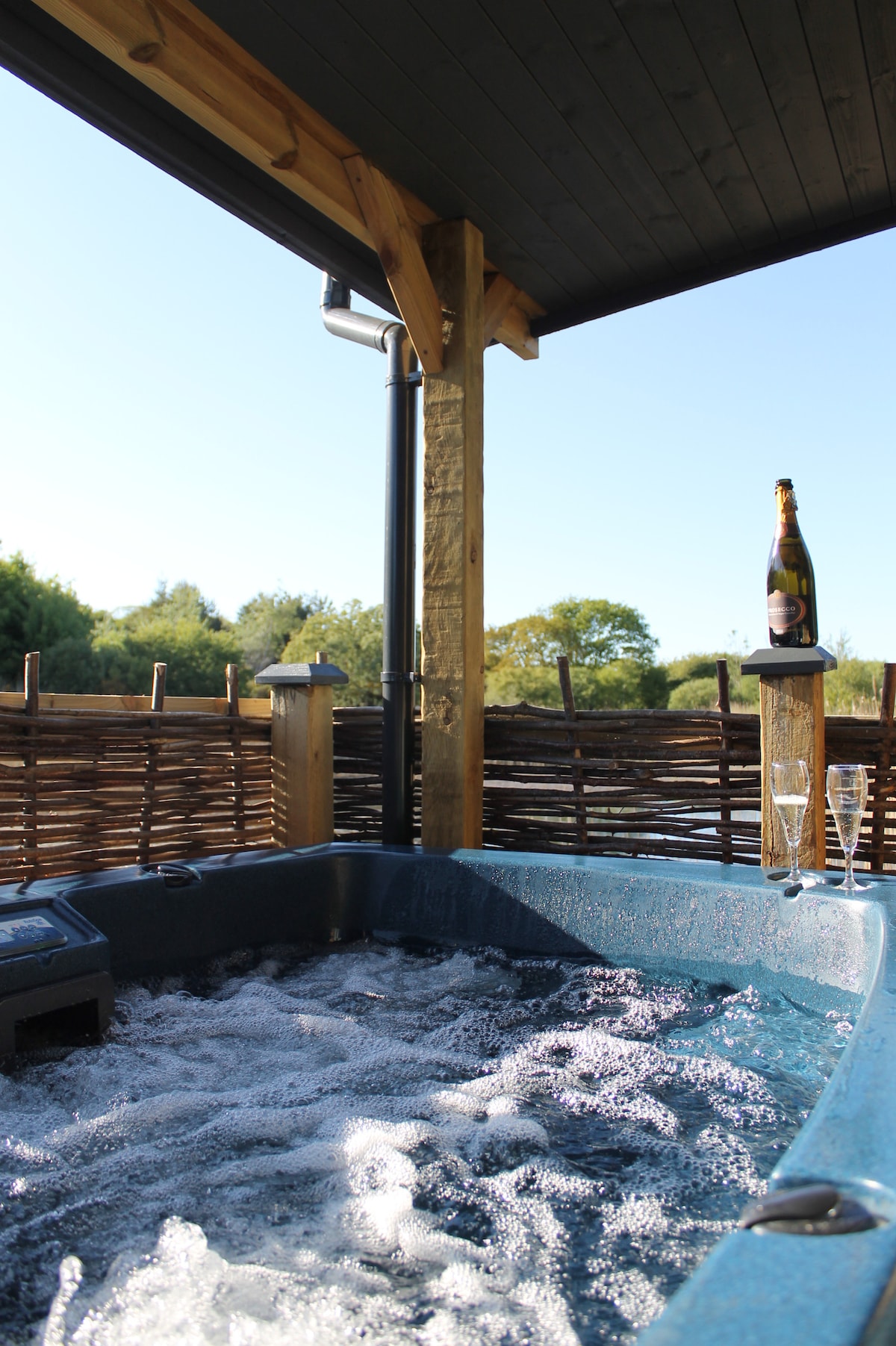Lake house lodge es una cabaña independiente construida sobre un pequeño lago situado en unos 4 acres de nuestros terrenos, tiene una terraza parcialmente cubierta orientada al sur que proporciona áreas al aire libre protegidas y lugares para tomar el sol, la terraza tiene su propia bañera de hidromasaje personal de dos plazas. La cabaña tiene un dormitorio con baño con ducha y una pequeña cocina, sin horno/encimera en el interior. una parrilla de gas afuera con un anillo de gas para cocinar al aire libre bajo el área cubierta. NO hay wifi, datos móviles disponibles en el exterior.
