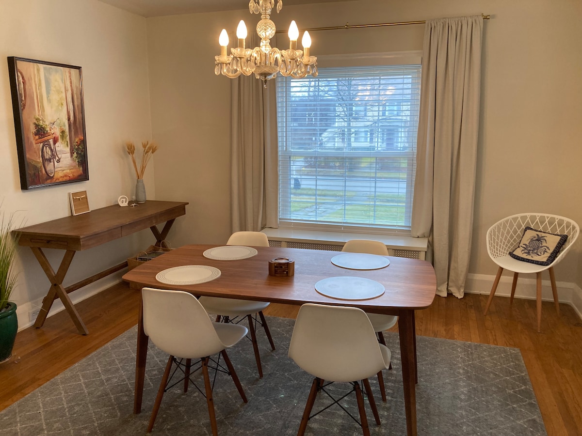 Nuestro acogedor espacio en el corazón de Kamm's Corners es el refugio perfecto para los viajeros que buscan relajarse y recargar las pilas. Estamos ubicados en el centro de un barrio tranquilo, ofreciendo la combinación perfecta de comodidad y tranquilidad. Con comodidades bien pensadas y una decoración elegante, hemos creado un espacio donde puedes sentirte como en casa. * A 15 minutos del centro de la ciudad. * A 7 minutos del aeropuerto de Cleveland Hopkins. * A 18 minutos de la Clínica Cleveland. * A 12 minutos del Centro I-X. * A 3 minutos del Hospital Fairview.