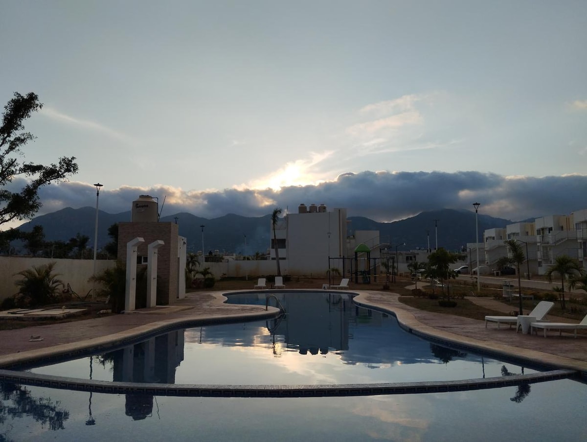 Departamento en planta baja con Aire Acondicionado, alberca, amplio patio trasero, estacionamiento propio frente a la ventana y vigilancia las 24 hrs., agua caliente, Wi-Fi, t.v. smart ROKU con Vix, cocina integral, utensilios de cocina, sartenes, platos, cubiertos, refri, horno de microondas, cafetera, licuadora, plancha. El portón de la entrada es a control remoto para los vehiculos. Ubicado a 15 min de la playa de Puerto Marqués, 18 min al Revolcadero, cerca de plaza comercial el Patio.