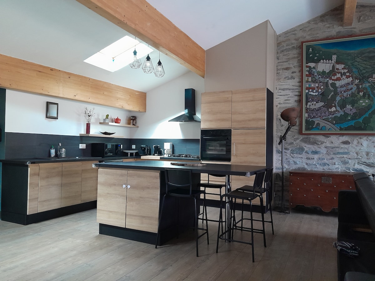 Loft en el corazón del país catalán. En un hermoso pueblo, mi loft es el lugar ideal para descansar y descubrir las playas y montañas catalanas. - Una hermosa terraza orientada al sur con vistas a las montañas y sin vecinos. - 130 m2 - 1 suite principal con 1 cama grande de 160 - 1 dormitorio con 1 cama grande de 140 + una cama individual de 90 - 1 espacio dormitorio con una cama de 90 - dos baños. - una cocina totalmente equipada - un patio privado en las habitaciones - TV y wifi - Estufa de leña