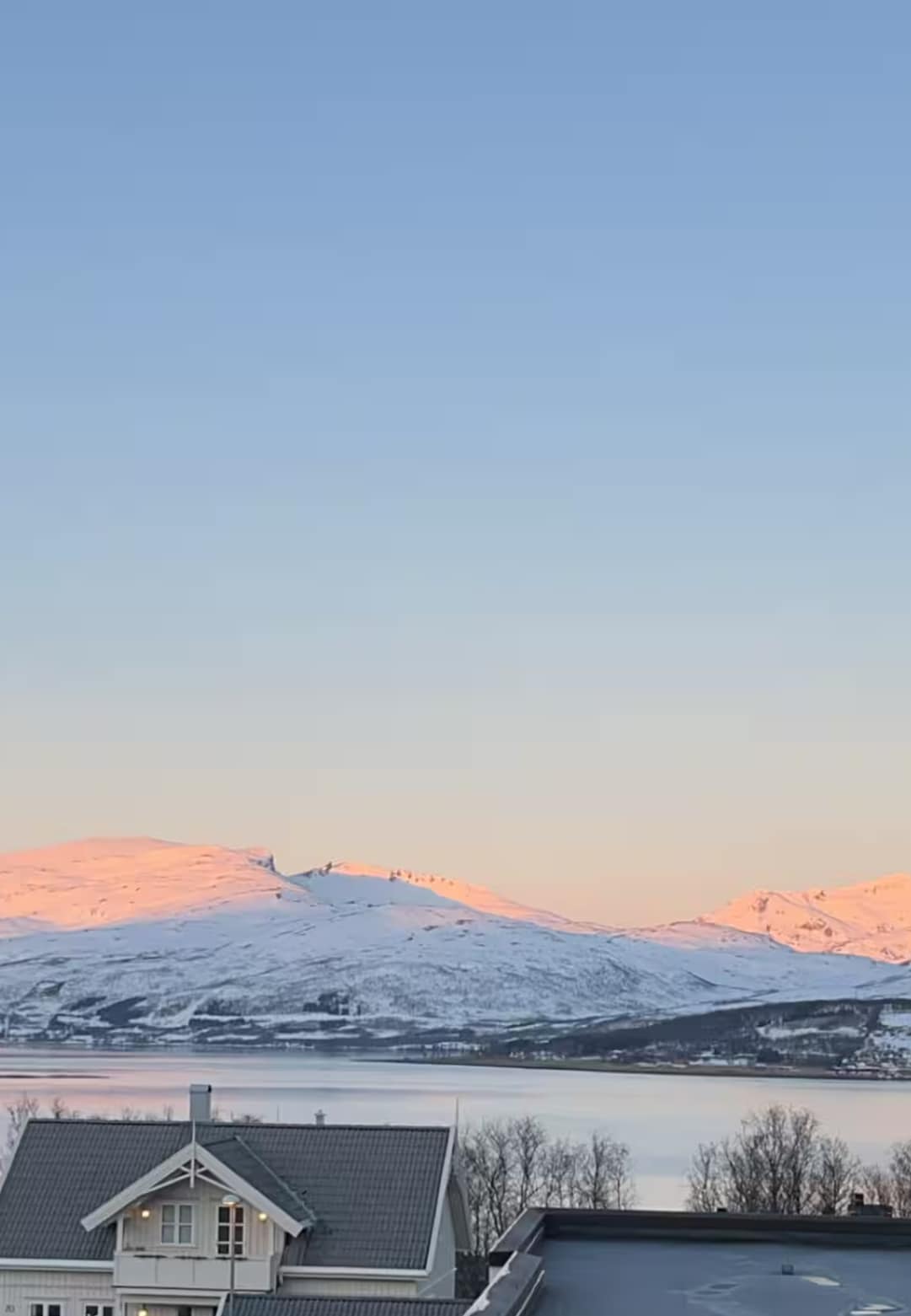 Casa de 3 plantas con enormes ventanales que se ciernen sobre la ciudad. (Tiene baño turco de vapor) La terraza de la azotea te ofrece una vista de 360 grados a todas las montañas circundantes. Además, es perfecta para admirar las luces del norte por la noche. La casa se encuentra a 1,2 km del centro de Tromsø, autobús desde la casa (5 minutos hasta el centro). Tiene 2 dormitorios en 1 piso (4 personas) y un sofá grande (cama) en la sala de estar en el segundo piso. El tercer piso es lavadora y secadora con entrada a la terraza. Estilo de madera único, 70 m2