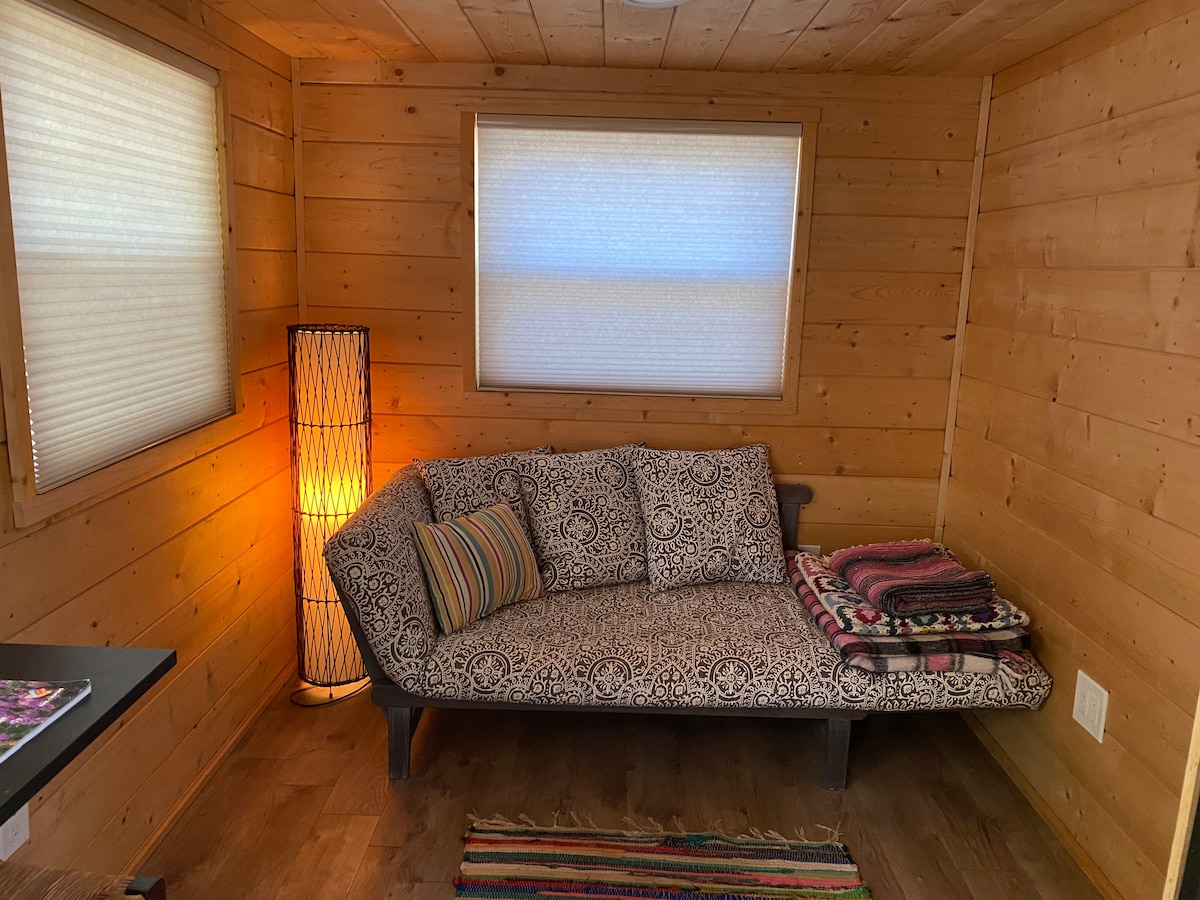 Disfruta de este encantador entorno y de este romántico lugar en la naturaleza. Tiene una cocina completa con fogones, suministros y nevera, una sala de estar con mesa, un baño completo con ducha, lavabo e inodoro, tiene un sofá que se despliega hasta convertirse en una cama tamaño queen en la parte posterior. Cuenta con TV e internet, ropa de cama, mantas y toallas. Mesa de picnic al aire libre, luces parpadeantes, chimenea y columpio para dos raquetas de💜 bádminton, frisbee, mesa de ping pong instalada en el granero. Disfruta de este hogar lejos de casa🌸 bajo las estrellas.