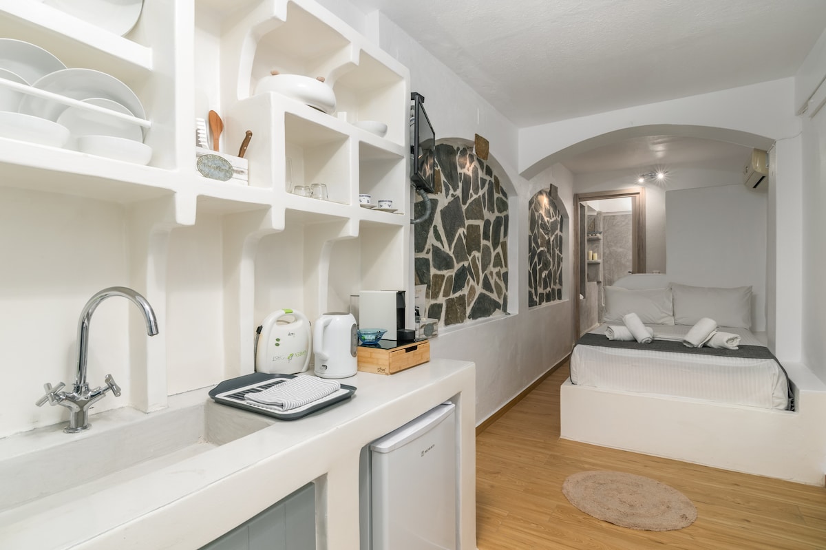 Aphrodite Studio forma parte de una casa tradicional de las Cícladas con una vista elevada del puerto marítimo de Adamas, construido por refugiados cretenses en 1860. Desde entonces, ha sufrido mejoras significativas, con todas las comodidades modernas, como electricidad, agua corriente, un inodoro moderno y una cocina. Todavía mantiene su carácter cicládico, con techos altos y un techo de madera resistente. Es ideal para 2 personas.