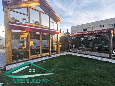 Location estivales à Kelibia : maison en bois S+2 avec piscine situé à 3 minutes en voiture de plage mansourah composé de deux chambres à coucher, un salon, une cuisine bien équipée et une salle d’eau. Maison avec une magnifique terrasse gazonnée avec une belle vue de fort. Maison avec une grande piscine et abris voiture. Nombre maximum de personnes : 6 personnes. Reference : LCV010