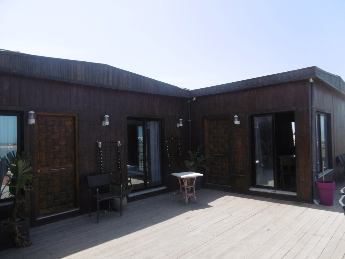 Hermosa casa de madera de 2 plantas que se encuentra en una ubicación absolutamente tranquila en una parcela de aproximadamente 7 hectáreas con unas vistas maravillosas. Es ideal para un pequeño grupo de amigos, así como para una pareja o una familia. Ideal para personas estresadas que buscan tranquilidad. La casa está situada en un pequeño lago con playa e isla. A unos 13 km de la playa y del centro de Hammamet. Se pueden hacer pedidos de comida con antelación. Tenemos animales en libertad