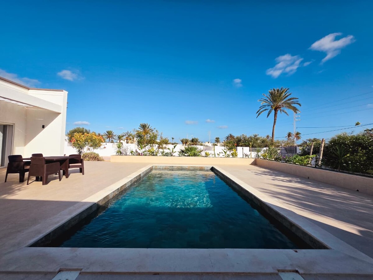 Dar Mima, a luxurious villa in the heart of Djerba, is a testament to craftsmanship and elegance. With a blend of Djerbian tradition and modern flair, it offers a serene escape just 700 meters from the beach and 100 meters from the golf place. In minutes, guests can reach vibrant discos, the Aqua Park, and more. Experience the charm of Dar Mima and uncover the essence of Djerba.🌴