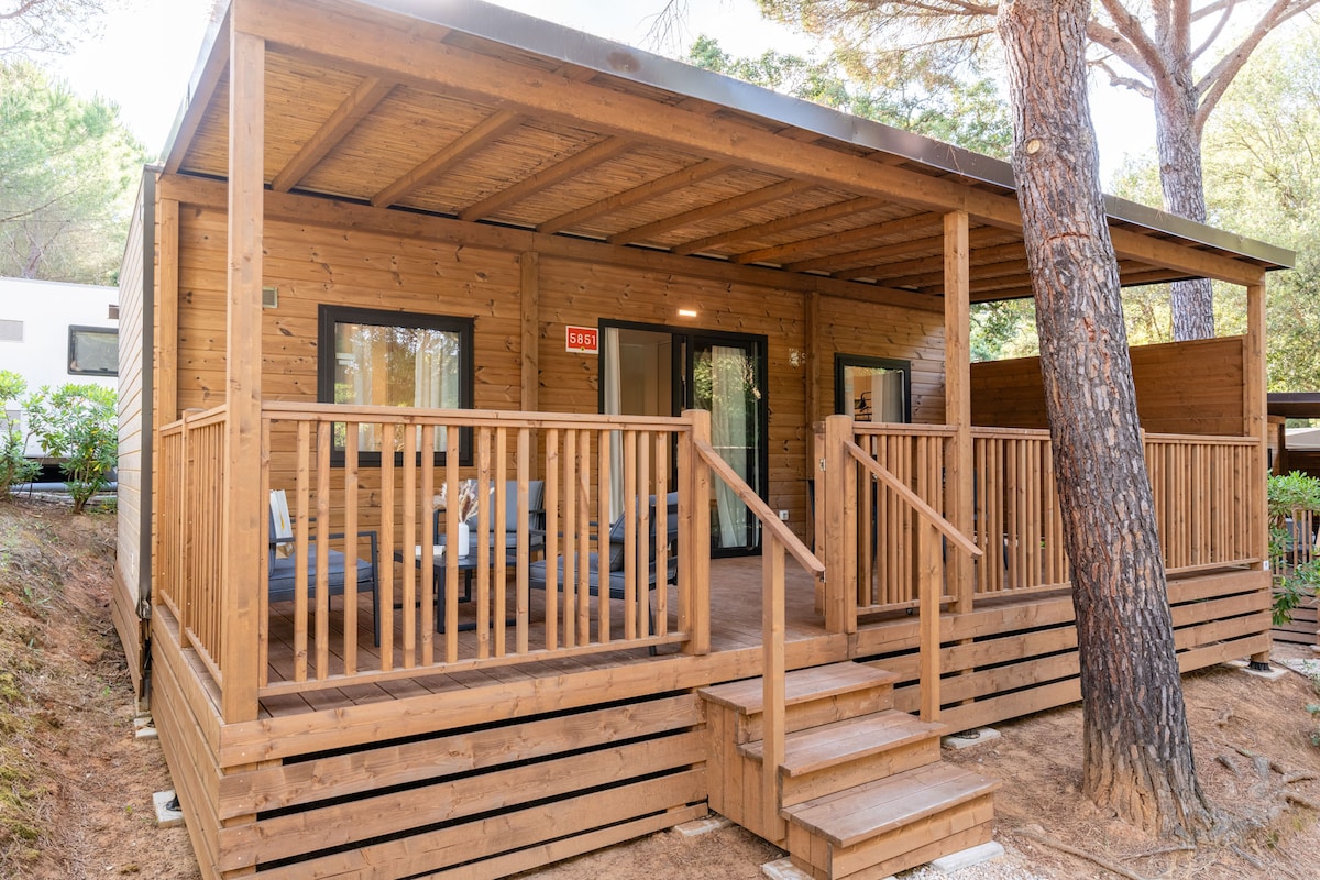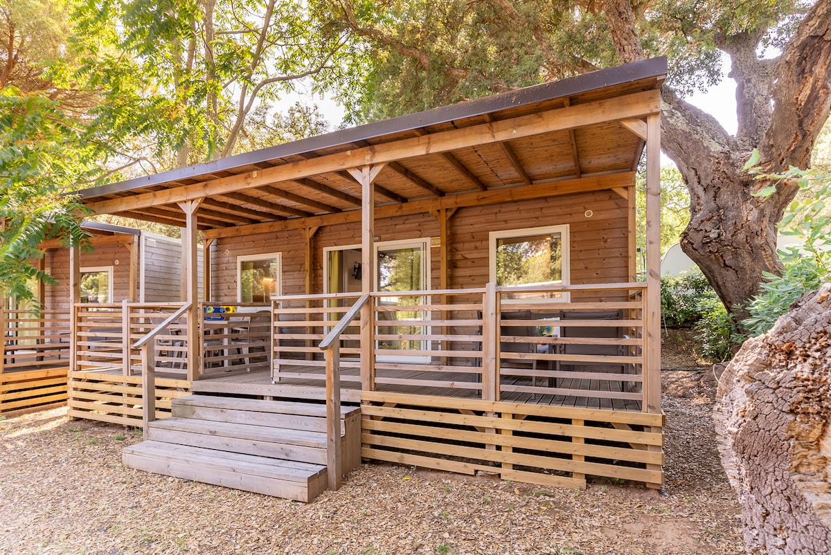 Animali su richiesta. Dimensioni: 32 mq + veranda 20 mq con cancelletto. 1 camera da letto matrimoniale, 2 camere con 2 letti singoli, Ampio soggiorno abitabile con tavolo e sedie. Cucina completa di stoviglie, frigorifero, fornello e microonde, TV LCD, Cassetta di sicurezza, Aria condizionata/Riscaldamento, 2 bagni con wc, lavabo, box doccia ed asciugacapelli. Veranda esterna in legno coperta dotata di cancelletto di sicurezza. Tavolo e sedie da giardino in veranda. Posto auto in villaggio.