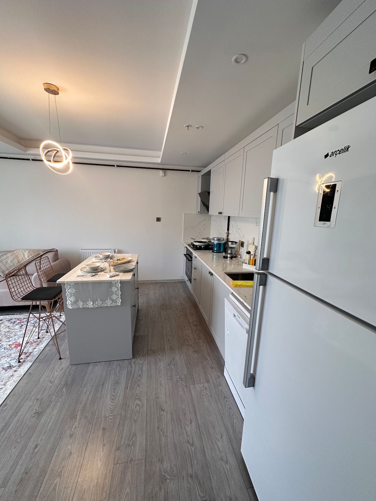 Puedes relajarte en familia en este alojamiento tranquilo. Está en una ubicación magnífica a 5 minutos del aeropuerto. Un apartamento tranquilo en el Lens Yaşam Merkezi, que incluye restaurantes de las cocinas del mundo.