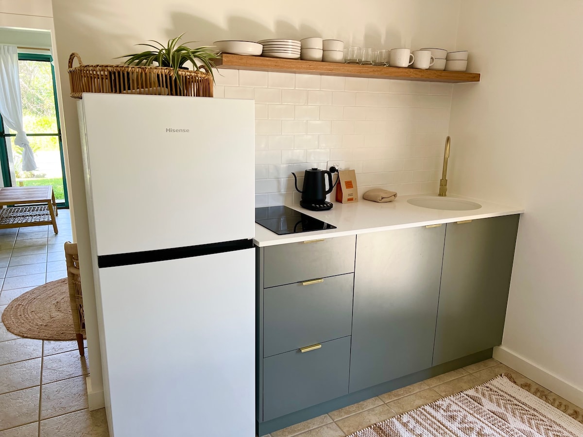 Un acogedor pequeño estudio/apartamento a solo 2 minutos a pie de la playa y del café local Bay Roots. Un dormitorio y una sala de estar separada con una pequeña cocina, que incluye lavandería y secadora. Perfecto para una tranquila escapada a la playa en la hermosa Byron Shire. Este departamento privado está ubicado en la planta baja de mi casa con mi espacio habitable separado en el primer piso. Ubicado entre jardines tropicales a solo 100 metros de la hermosa South Golden Beach.
