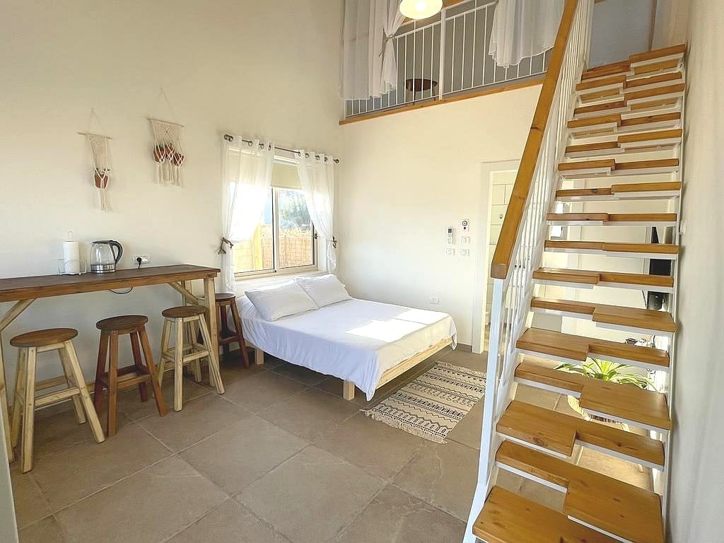 Unidad pequeña e íntima con entrada independiente. Sala de estar en la planta baja con sofá, mesa, televisor inteligente, cocina americana y ducha/inodoro, y en la galería una cama doble. Ideal para parejas jóvenes o individuales. Menos adecuado para personas mayores a pocos pasos del río Jordán y del paseo marítimo de Ami. En el kibutz: un café que también sirve el desayuno. Granjas de caballos, granjas lecheras, ganado y temporada de piscina. En el centro del valle de Hula, cerca de todos los sitios turísticos del norte.