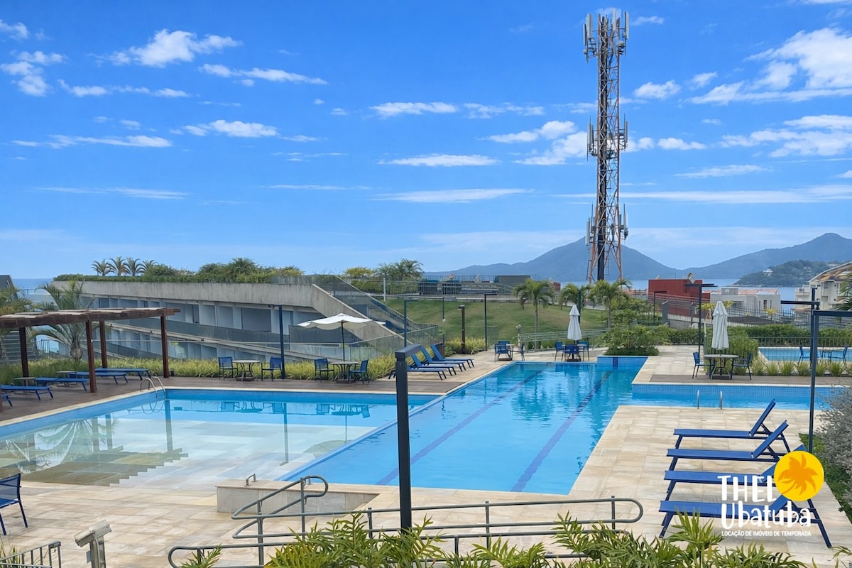 Apartamento en el condominio Reserva DNA, Praia Grande - Ubatuba. Tiene 2 baños en suite, un inodoro y un balcón gourmet con parrilla. Unidad totalmente equipada: Aire acondicionado, Wi-Fi, cocina completa y lavadora y secadora. Tiene capacidad para 6 adultos y 2 niños (hasta 5 años). Ubicado en el segundo piso. Check-in: 2:00 p. m. | Check-out: 10:00 a. m. ¡Ocio completo! (Nota: Las piscinas están cerradas por mantenimiento los martes).