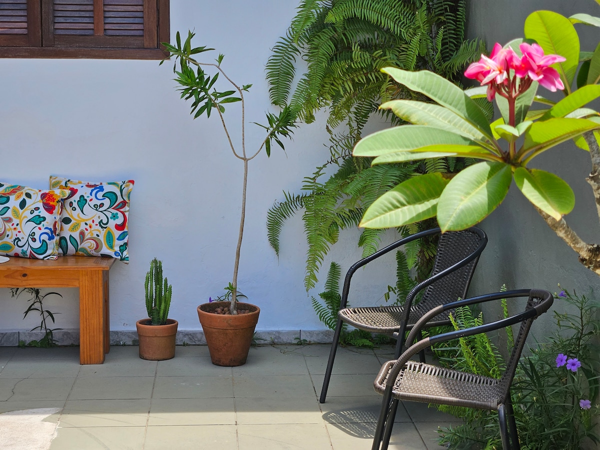 Espaço completo para 01 casal, área útil 45m2 em propriedade com outras unidades. 01 vaga carro descoberta, portão automático. Cama Queen, Ar 12000 BTU, ventilador, smart TV 50", cozinha exclusiva com microondas, frigobar, fogão 02 bocas sem forno, liquidificador, sanduicheira, cafeteira, filtro de barro. Terraço com churrasqueira, Internet claro fibra, piscina compartilhada. Praia Vermelha Praia Vermelha 100m, Tenório 400m, Cedro 1 km. Muito verde, pássaros, som do mar e ar condicionado