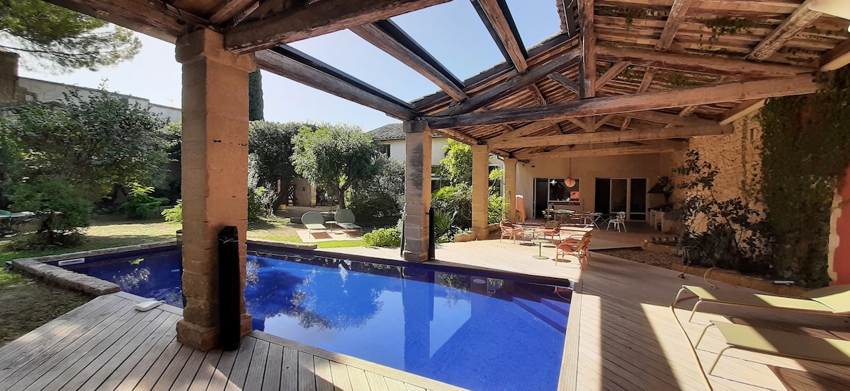 Notre maison vigneronne « mas_abelas » est située au coeur du très beau village d'Aigues-Vives, dans la région de la Vaunage. Elles se situe à proximité des commerces, boulangeries, épiceries, boucheries, bars, restaurants., etc... Le mas, d'une surface de plus de 350m2, est attenant à un grand préau ou se trouve la grande piscine (11x4,5M) dans un jardin luxuriant sans vis à vis et ombragé. C'est un endroit idéal pour se ressourcer, venir en famille, entre amis, faire du co-working.
