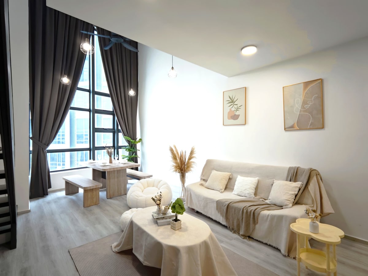 ¡Nuestro Grand Loft está repleto de todo tipo de comodidades e instalaciones que necesitarás! Estamos amueblados con muebles de primera calidad, unidad de entretenimiento (karaoke) y acabados exquisitos que no solo aportan más valor, sino también una experiencia inolvidable. Estamos situados a solo 15 minutos del centro de negocios, a 5 paradas de Bukit Bintang (Pavillion) y a 6 paradas de KLCC en tren. Estamos estratégicamente ubicados a 4 minutos a pie cubierto a través del centro comercial hasta la estación de MRT en el nivel 1.