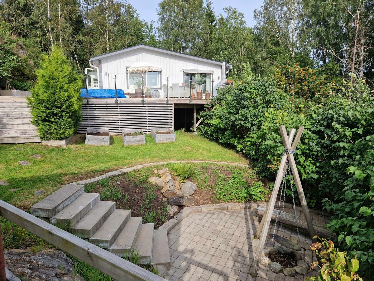 Comfortable holiday house for 6 pers, just outside Uddevalla, in the heart of the Swedish west coast. Perfect location with lots of privacy. Separate guesthouse available. Spacious terrace for sunbathing and evening bbq. You will love swimming in the fjord. Private beach and jetty (for the neighbourhood). Open fireplace and unlimited Wi-Fi. The house is also super cosy during the winter with an open fire place, warm bath in the hot tub and the sauna. A fantastic place to reflect over life.