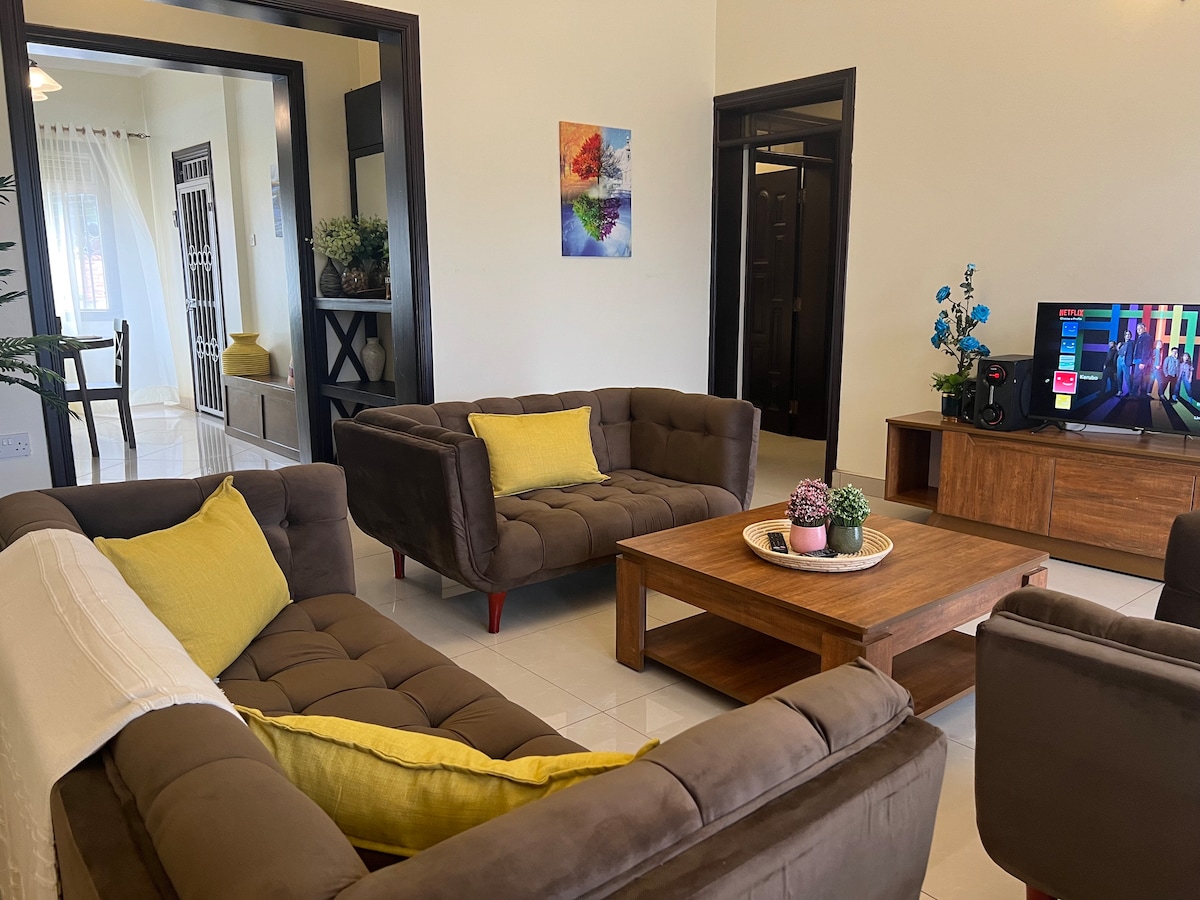 Luxurious, spacious, fully furnished 2-Bedroom apartment in Kisasi Kikaya, Kampala all to yourself!Cleanliness is top priority, all beddings and towels are white and the apartment is cleaned daily at no extra cost!Located Just steps from the Bahai Temple, and only a 5KM drive from Acacia Mall. 3 balconies to enjoy the views. Kitchen fully fitted with mordern appliances. Smart 55 inch TV! Lush green gardens outside and a pergola perfect for making memories. The flowers were chosen with love!