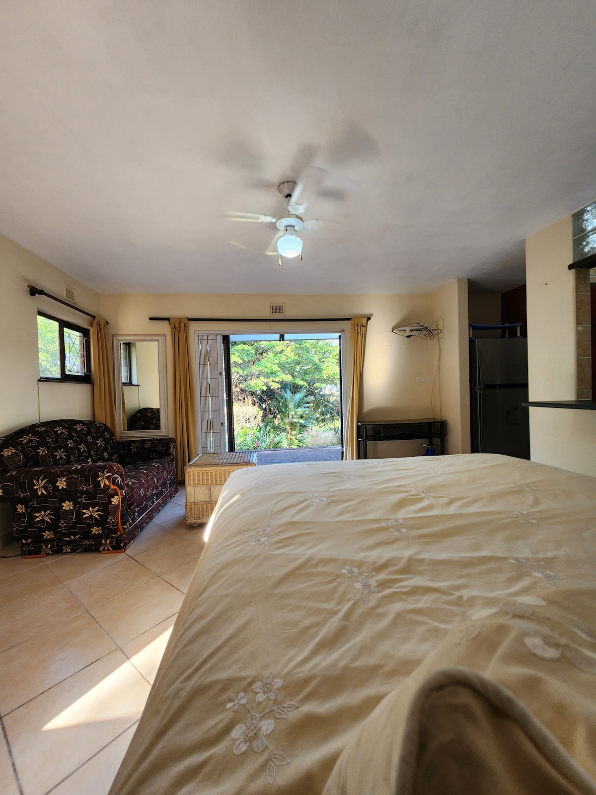 Cottage under our house with a small kitchen bedroom and bathroom. It is a self catering unit with bar fridge, micro wave oven and 2 plate stove with oven and kitchen cutlery and utensils. We have 2 small dogs a Yorkie and Jack Russell. There is a braai facility and a large swimming pool. Tv and wifi available. House is surrounded by a beautiful tropical garden and is quiet and peaceful. We are about 1000 metres from nearest beach. Open parking facility available. Infants and children allowed.