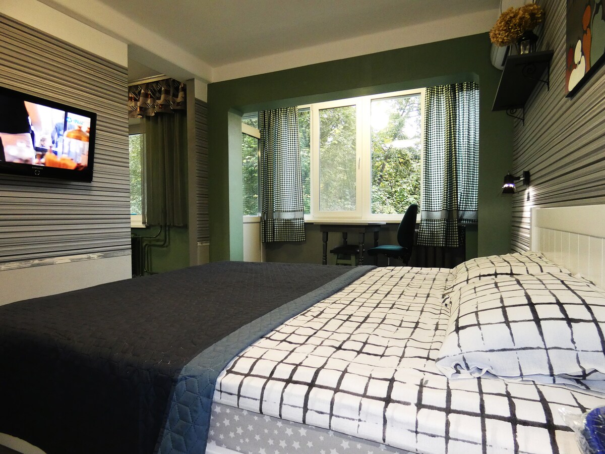 Un acogedor y moderno estudio tipo hotel con elementos de estilo loft. El apartamento se ubica en el segundo piso. El edificio está situado en el centro de Kiev, cerca del centro comercial Gulliver, no muy lejos del Estadio Olímpico y de la calle Khreshchatyk, a 5 minutos a pie de la estación de metro «Palacio de los Deportes». El apartamento tiene una cama tamaño king y, si es necesario, una cama plegable adicional. El estudio tiene una pequeña cocina, baño y aseo con todo lo necesario, TV e internet.