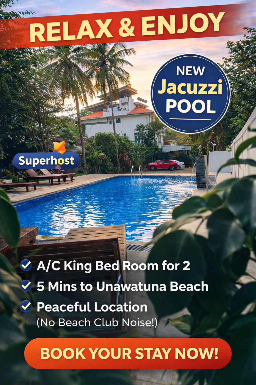 • 🌴 Located in the heart of Unawatuna tourist city • 🏖️ Only 0.5 km to Unawatuna Beach • ❄️ Double King Bed A/C room • 🚿 Private attached bathroom with hot water • 🏢 17 well-maintained rooms across 3 floors • 🛏️ Room floor allocated based on availability • 🏊♂️ Brandnew swimming pool (Very few places offer) • 👮24*7 On duty Security officer • 📩 Kindly inform us early for ground-floor preference • 🚶 Restaurants, ATMs & transport steps away • 💰 Great value in a top tourist location