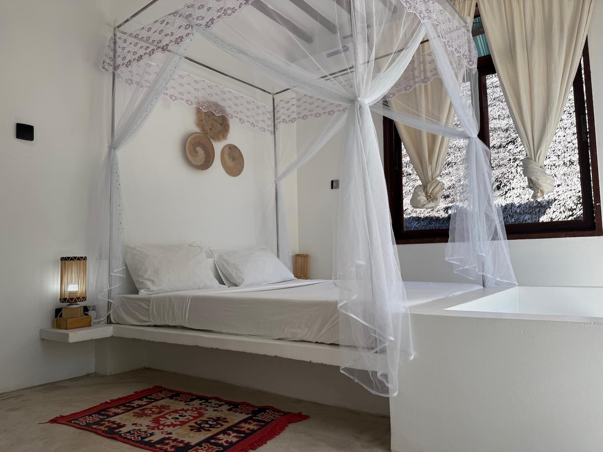 ¡Nuestro nuevo estudio#3 cuenta con todo lo que necesitas para tus vacaciones perfectas en la isla en Zanzíbar!A pocos pasos de la playa de arena blanca con aguas turquesas. Relájese en el jardín privado con plantas tropicales verdes.El estudio está situado en la planta baja de una casa de playa, con una terraza sombreada, jardín tropical, comedor al aire libre, sillas tradicionales swahili y tumbona. Acceso privado a tu elegante alojamiento. ¡Cama de matrimonio con bonitas sábanas y el baño siempre agua caliente! Cocina pequeña con nevera y estufa. ¡Realmente una joya!