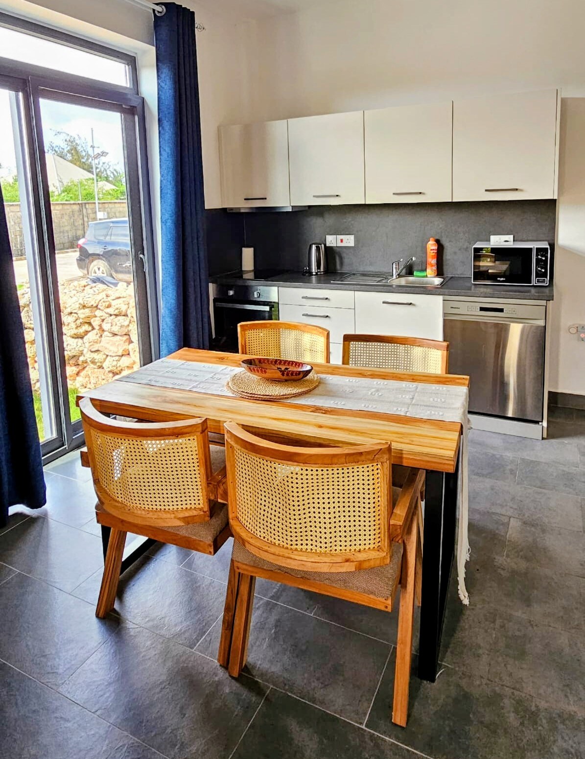A stylish and fully serviced apartment situated in a serene And beautifully developed Fumba town, which is a lush green residential, right by the Indian Ocean. This apartment is filled with subtle and soothing aroma which gives you comfort and not just that, there’s a soy wax candle to light when you crave a cozier atmosphere. The location is just 20 minutes away drive from Stone town, and close to the best Zanzibar beaches. Inside the residence, there is a local restaurant called kwetukwenu.