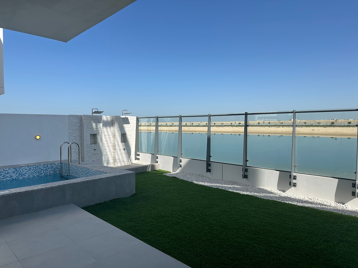 🏝️ Villa de lujo de 4 dormitorios frente a la playa en Sun Island, Sharjah Waterfront City, a solo 45 minutos de Dubai Marina. ☀️ Piscina privada climatizada, jacuzzi y acceso directo a la playa. 3 camas tamaño king + 2 camas individuales, habitaciones con vista al mar, dos áreas de estar con televisores de 86” y 65”, cocina totalmente equipada, terraza en la azotea, 4 plazas de estacionamiento, tecnología de hogar inteligente y check-in autónomo. Llegada: 4:00 p. m. | Salida: 11:00 a. m.