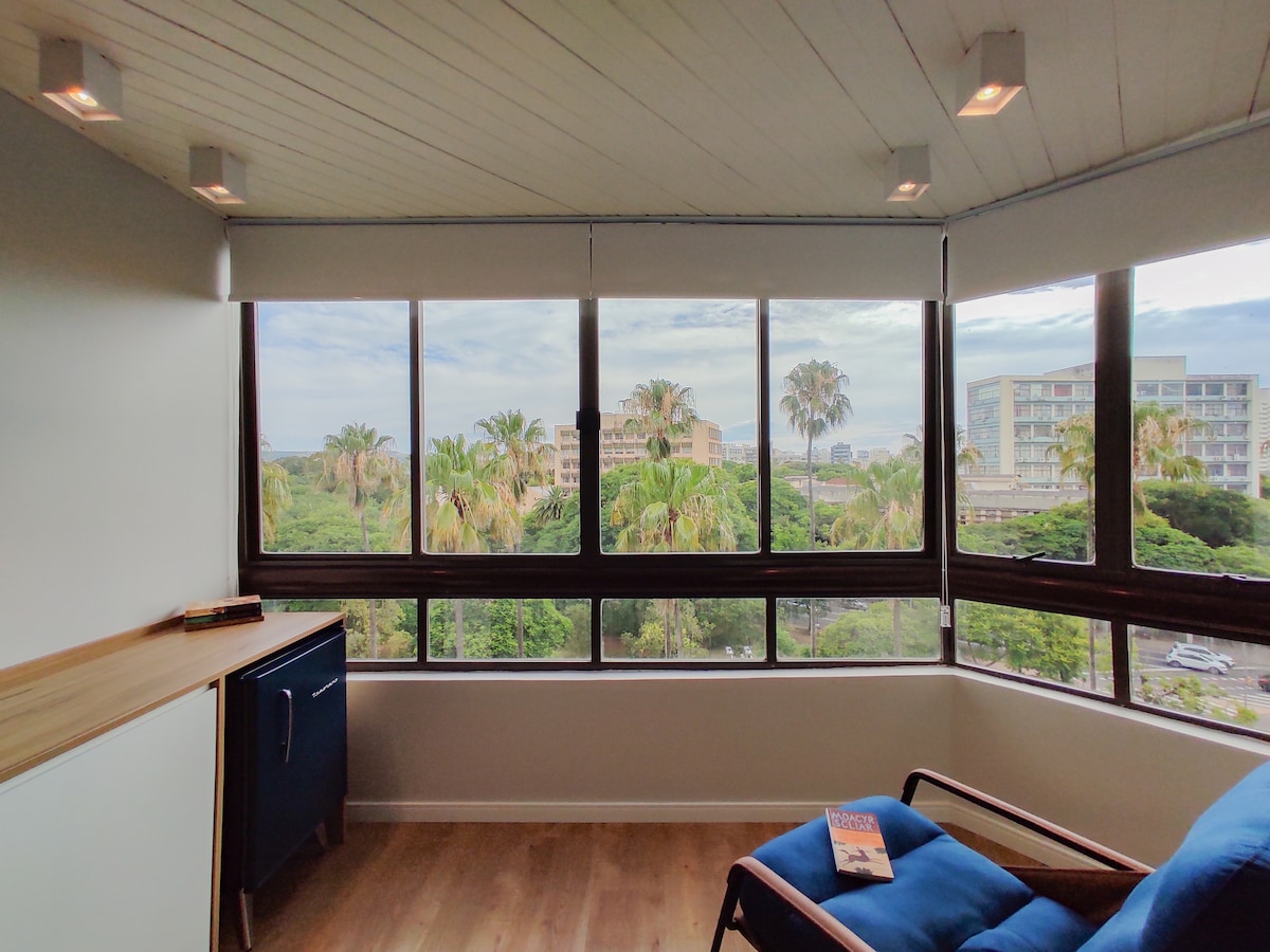 Estudio con vista al parque y automatización/Alexa. Garaje cerrado, cocina con artículos básicos y ropa de cama/baño. Ubicado en una zona céntrica, azotea con piscina, gimnasio y coworking. Parque da Redenção a pocos metros, Feria Orgánica y Brique los fines de semana, gastronomía Refúgio do Lago y espectáculos en el Auditorio Araújo Vianna. Cerca de los bares, restaurantes y vida nocturna de los barrios Cidade Baixa/Bom Fim. Fácil acceso a Orla do Guaíba, universidades, hospitales y otros barrios.