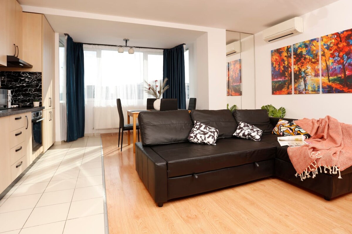 Moderno y acogedor apartamento de 1 dormitorio cerca de Plaza Mall, Afi Mall y cerca del centro de Bucarest. Espacios luminosos, un sillón, televisor inteligente y una cocina totalmente equipada con Nespresso. Disfruta de artículos de tocador Rituals, un balcón relajante y estacionamiento gratuito. Perfecto para un máximo de 3 huéspedes que buscan comodidad, estilo y fácil acceso al metro, parques, restaurantes, cafeterías y vida urbana.