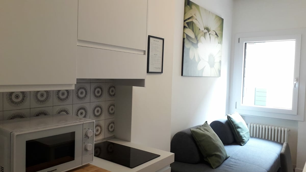 Pequeño estudio en un tranquilo callejón entre dos de las calles más características del centro. Ideal para una pareja que quiere pasar una estancia romántica o para viajeros y trabajadores que buscan todas las comodidades. Pórticos, tiendas, adoquines, vistas, puentes, riberas... son colores, aromas y agradables sonidos que te acompañarán en una ciudad que aún se puede vivir. El alojamiento se encuentra exactamente a medio camino entre Via Savonarola y Via Beato Pellegrino, el centro del barrio de Savonarola.