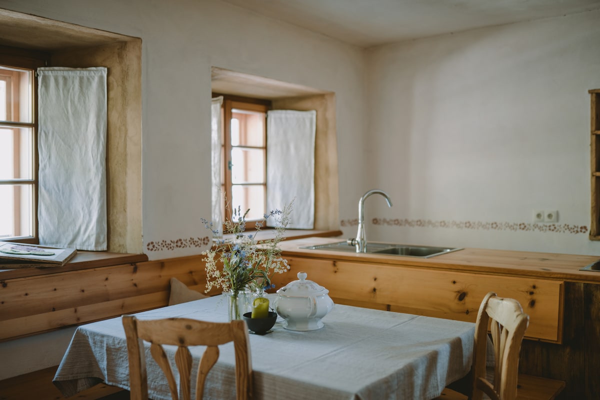 Hof Neuhaus, perfecto para los amantes de la paz. Relájate en el apartamento de 63 m² Platzerer Jöchl, renovado con mucho amor y materiales naturales sostenibles. El apartamento, en su mayoría construido de madera maciza con muebles de alta calidad, puede alojar hasta 4 huéspedes. Además de la amplia cocina, el apartamento tiene 2 dormitorios con camas de madera de pino, así como un baño recientemente renovado. Tienes una terraza grande y acogedora con vistas al campo.