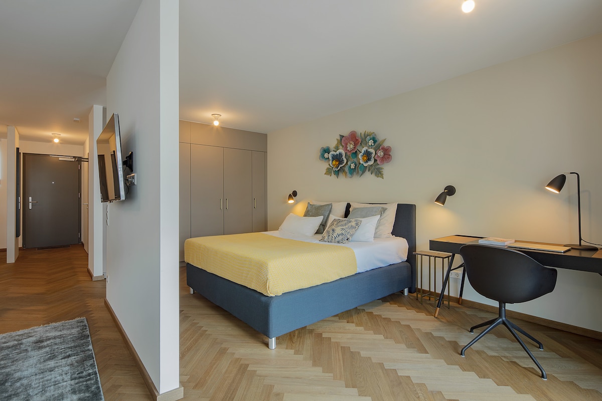 Alójate en un alojamiento exclusivo que está cerca de todas las atracciones. - Muebles de diseño (Saba Italia y más...) - Cama de día, tamaño de la cama: 100 x 200 cm, ropa de cama de satén, ropa de cama como en hoteles de lujo. - sofá cómodo, TV inteligente. - comedor y escritorio propios - cocina totalmente equipada - Acceso a la casa y al apartamento utilizando un PIN con llegada anticipada en línea - Lavadoras y secadoras en el sótano a través de WeWash - limpieza semanal
