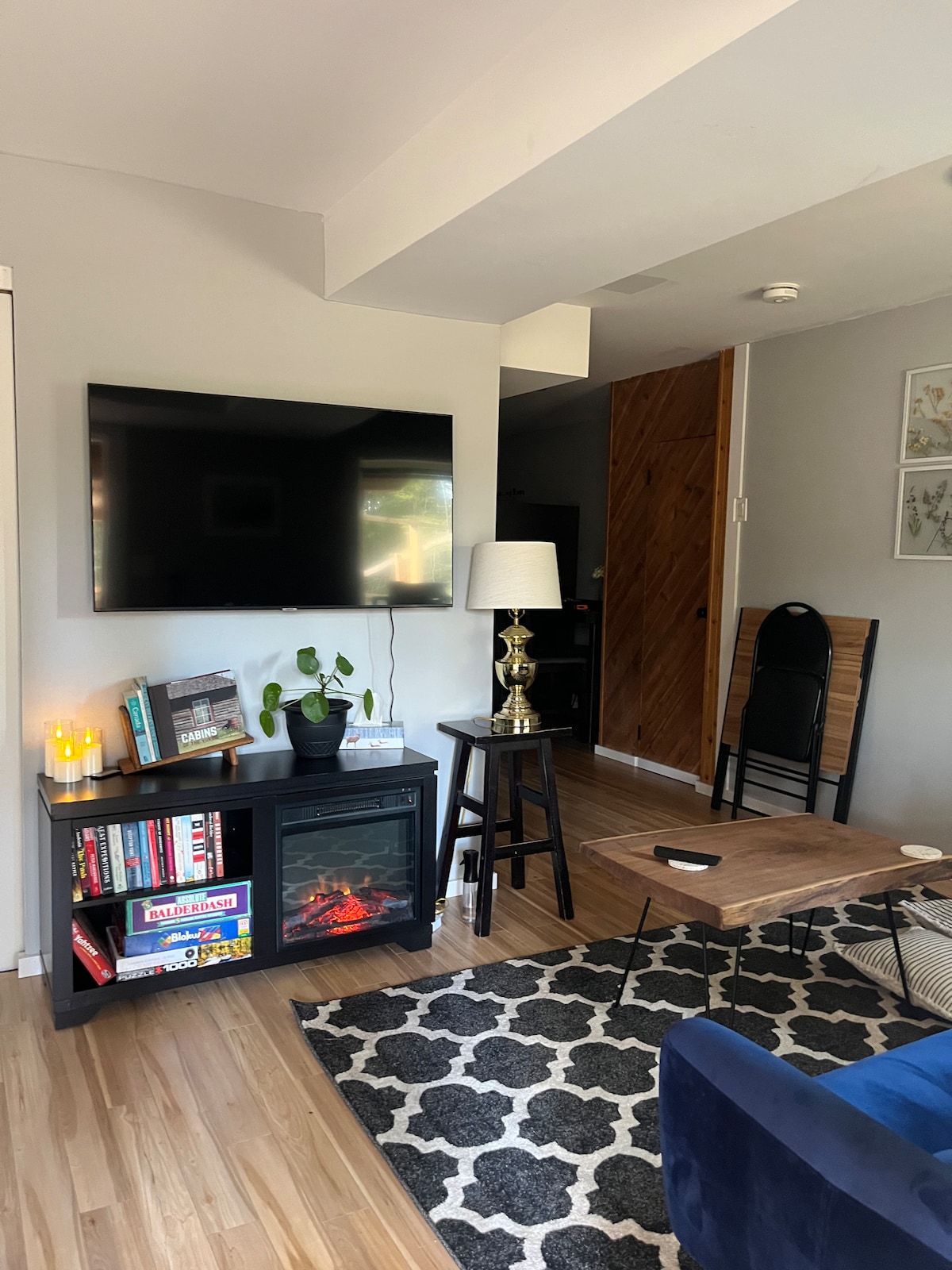 Kick back and relax in this stylish, peaceful space. Located 15 minutes from town by car, the suite is 1 bedroom, 1 bathroom built in 2023. The bedroom has a loft bed above the queen bed. The 3.7 acre property backs onto endless green space and trails. The suite contains a 400 sqft upper deck that has beautiful mountain views and can be great for northern lights viewing. The deck has patio furniture and a propane fireplace. Next to the rental suite is a log home that the property owners live in.