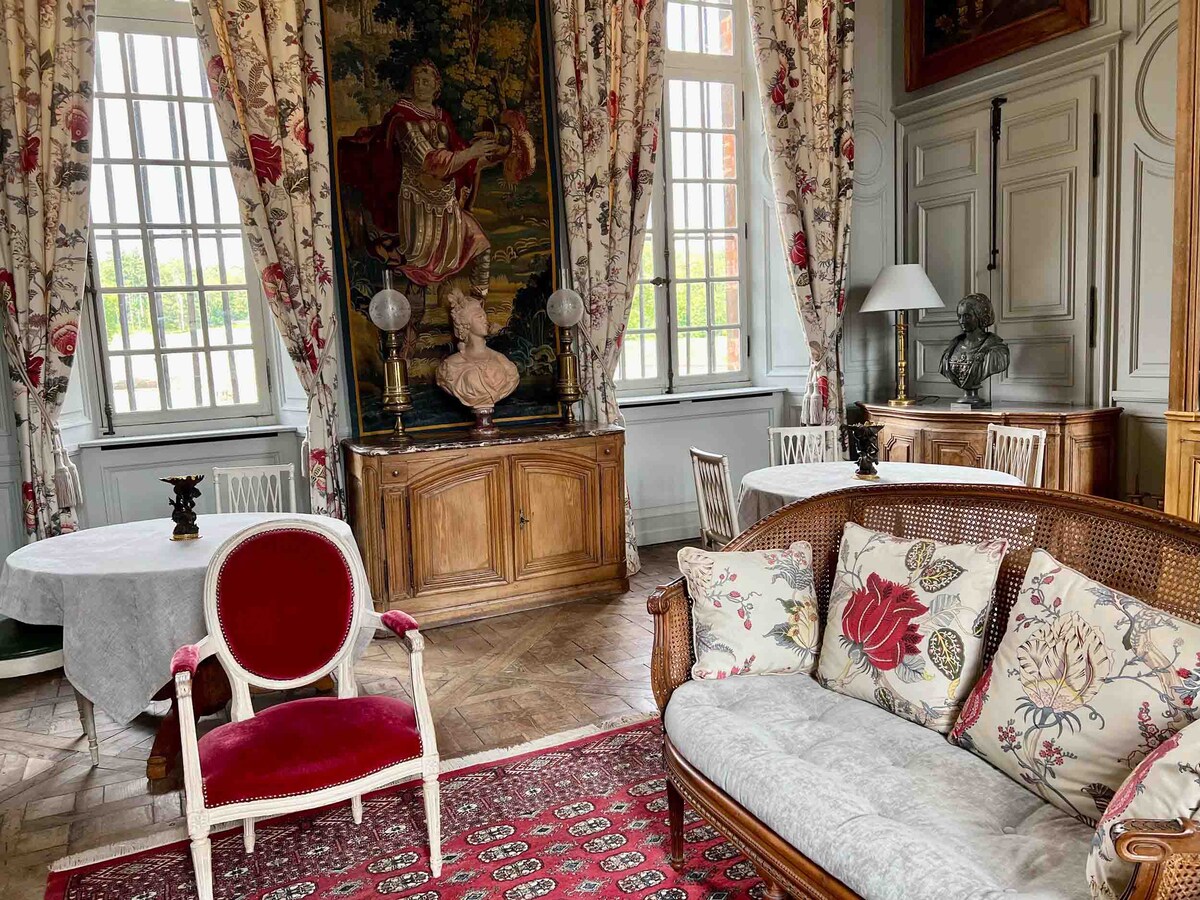 Los anfitriones del Chateau des Joncherets, Kate y Paul, te dan la bienvenida a una escapada romántica en la campiña parisina. A solo 70 minutos de París en tren o coche, ¡tu oasis te espera! Sumérgete en las vistas de tu estudio de nuestro castillo del siglo XVII, parque diseñado por Andre le Notre, plátanos clasificados y capilla. Desde tu ventana puedes ver a nuestros queridos pavos reales, garzas, faisanes, búhos y patos. Camina, haz un pícnic o pesca en 9 acres de bosque privado, canales y huerto. ¡O explora nuestro pueblo medieval!