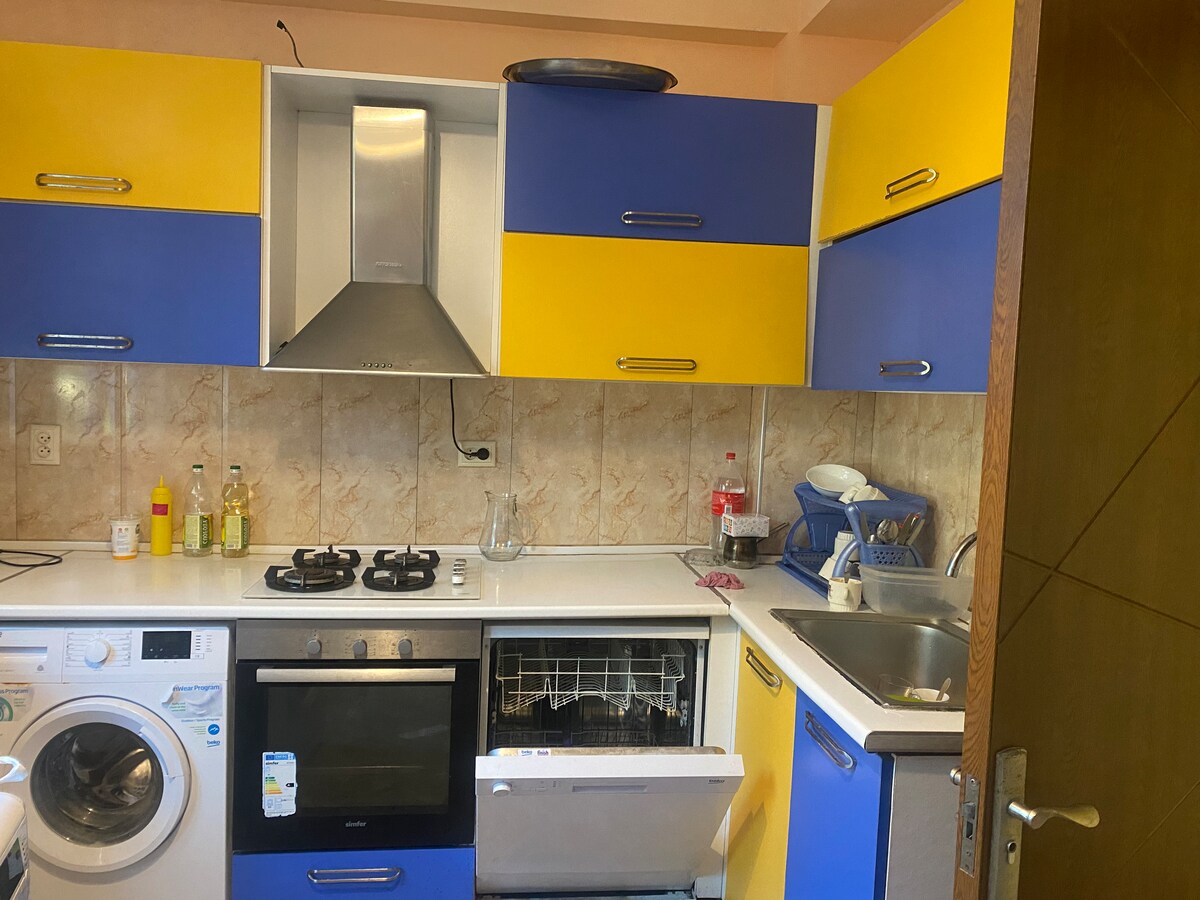 Un espacioso y luminoso departamento de 120 m² en el tercer piso de una casa privada con entrada independiente. El departamento tiene 2 dormitorios grandes, una sala de estar, cocina, baño y balcones. Cada habitación tiene aire acondicionado, balcón y calefacción central. La cocina está totalmente equipada, incluido un lavavajillas. Los huéspedes pueden utilizar la terraza, la piscina, el patio verde y la zona de barbacoa. El casco antiguo de Batumi está a 10 minutos a pie.